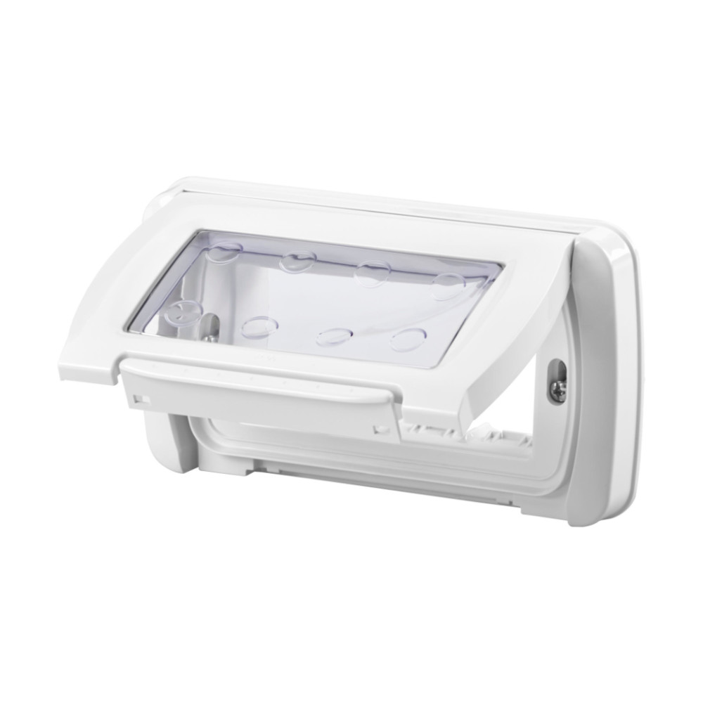 Placca autoportante stagna 4 moduli IP55 bianco nuvola di Gewiss System. Utilizzato per installare al suo interno tutti i frutti della serie System proteggendo da polvere e getti d’acqua gli interruttori e prese con coperchio chiuso.