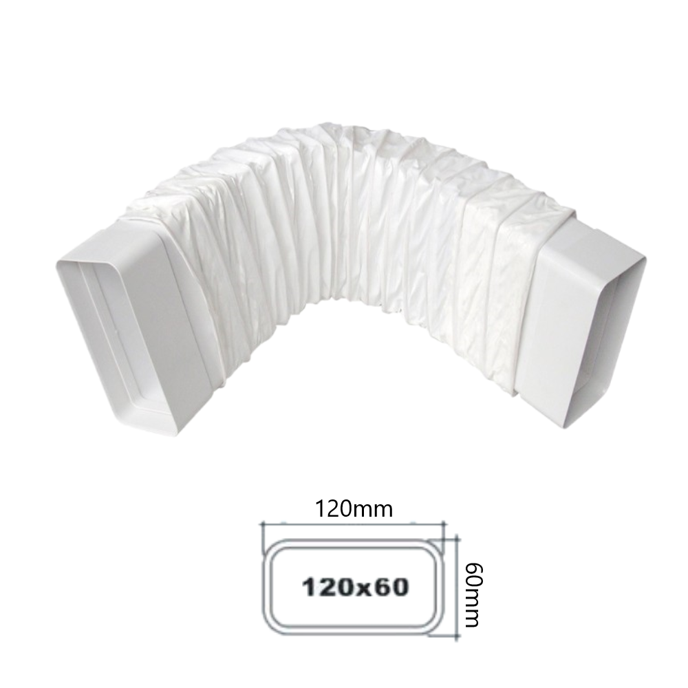 Giunto flessibile per tubo di areazione bianco rettangolare. Accessorio che garantisce l’installazione anche in situazioni scomode. Estensione massima 60cm. Questa tubazione permette la corretta evacuazione di vapori e odori sgradevoli da ambienti, favorendo un corretto cambio d’aria. Da notare il suo principale utilizzo su cappa domestica o su sistemi di aspirazione aria in ambienti particolarmente umidi come i bagni.