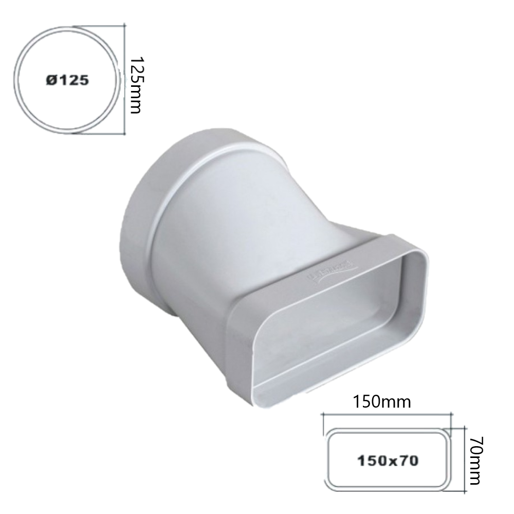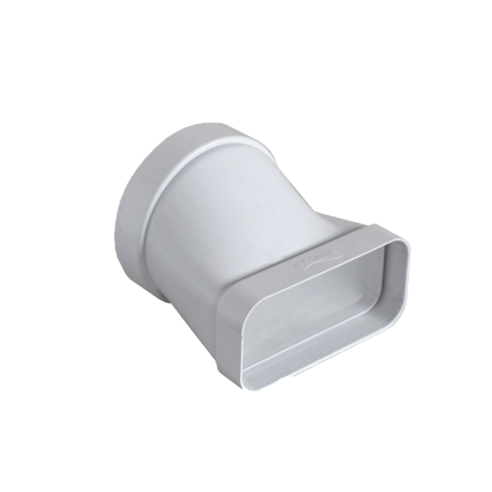 Raccordo di passaggio orizzontale da tubo rettangolare a tubo tondo e viceversa. Questa tubazione permette la corretta evacuazione di vapori e odori sgradevoli da ambienti, favorendo un corretto cambio d’aria. Da notare il suo principale utilizzo su cappa domestica o su sistemi di aspirazione aria in ambienti particolarmente umidi come i bagni.