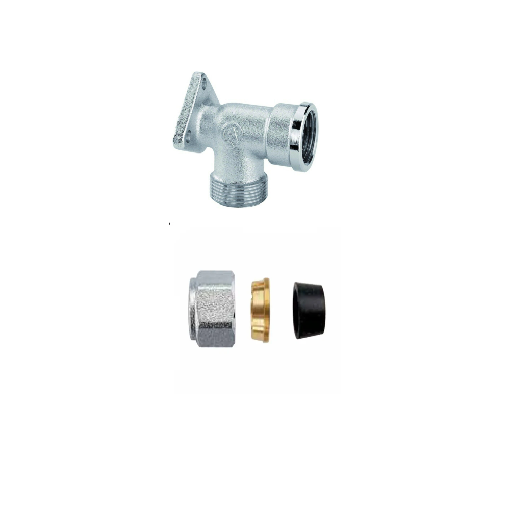 Il prodotto è composto da un gomito a 90° femmina da 1/2″, da un dado cromato, una guarnizione conica in gomma nera e da una rondella guida tubo in ottone.