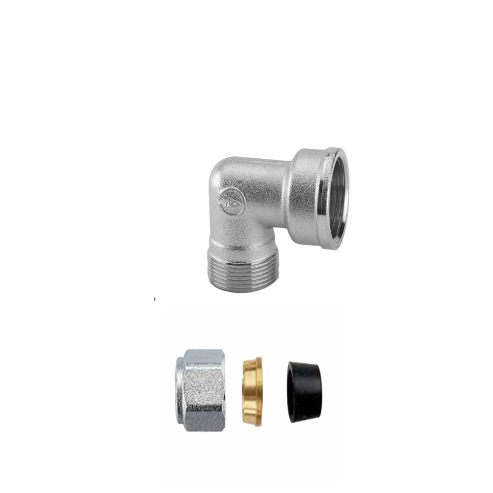 Il prodotto è composto da un gomito a 90° femmina da 1″, da un dado cromato, una guarnizione conica in gomma nera e da una rondella guida tubo in ottone.