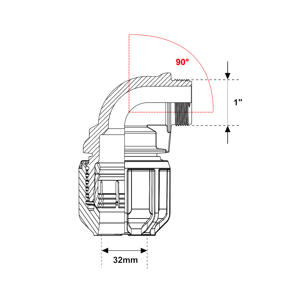 Raccordo a gomito maschio 90° a compressione 32mm – 1″ PN16, ideale per ottenere una curva di 90 gradi nella realizzazione di impianti di irrigazione. Il raccordo ad angolo è la scelta adatta per la costruzione di impianti di trasporto acqua con pressione massima di 16 bar. La giunzione è inoltre idonea al trasporto di acqua potabile. Il gomito si presenta con un attacco a compressione da 32mm, ed un attacco filettato maschio da 1″. Al suo interno il raccordo è dotato di una guarnizione, perciò è in grado di assicurare una tenuta idraulica tra il tubo e il raccordo. La connessione meccanica tra il tubo e il raccordo è garantita dalla ghiera di serraggio che impedisce al tubo di sfilarsi dal raccordo. In aggiunta è adatto ad essere accoppiato con tubi in polietilene per il trasporto di acqua potabile secondo la normativa UNI 9561. Il raccordo a gomito è realizzato in polipropilene, un materiale eccellente per la realizzazione di circuiti idrici. Infatti il polipropilene è in grado di garantire un’elevata resistenza agli agenti atmosferici, ed assicura un’elevata durata nel tempo. La giunzione ad angolo è la scelta perfetta per la realizzazione del vostro impianto idrico. Il raccordo angolare è disponibile in varie misure.
