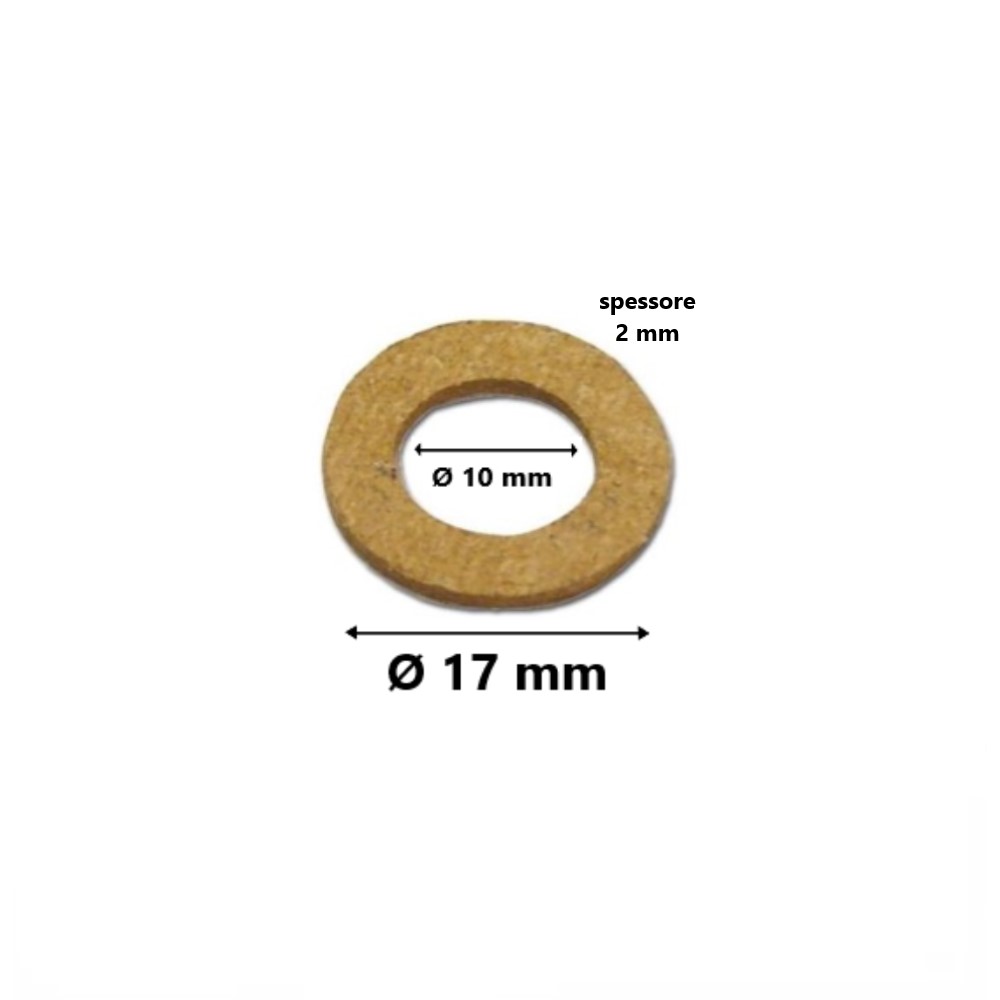 Guarnizione in fibra tipo sughero per bombole e riduttori gas GPL. Misura: Ø 17 mm x Ø 10 mm x Ø 2 mm.