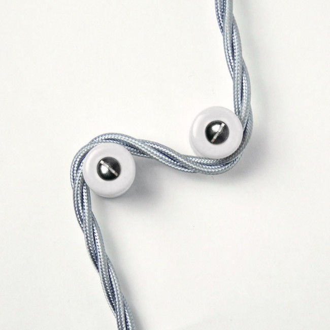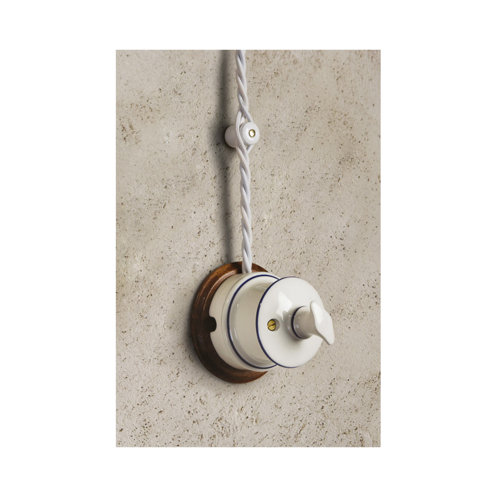 Isolatore in porcellana bianco vintage. Utilizzato per sostenere cavi in tessuto intrecciati per impianti elettrici esterni o ristrutturazioni di vecchi edifici dove non è possibile tracciare linee elettriche interne ai muri.