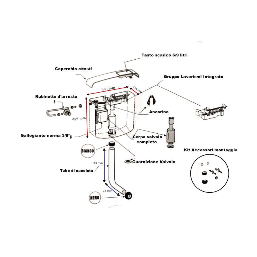 Ottima cassetta di risciacquo per WC compresa in kit con pulsante da installare esternamente ed azionare in modo semplice lo scarico della cassetta.