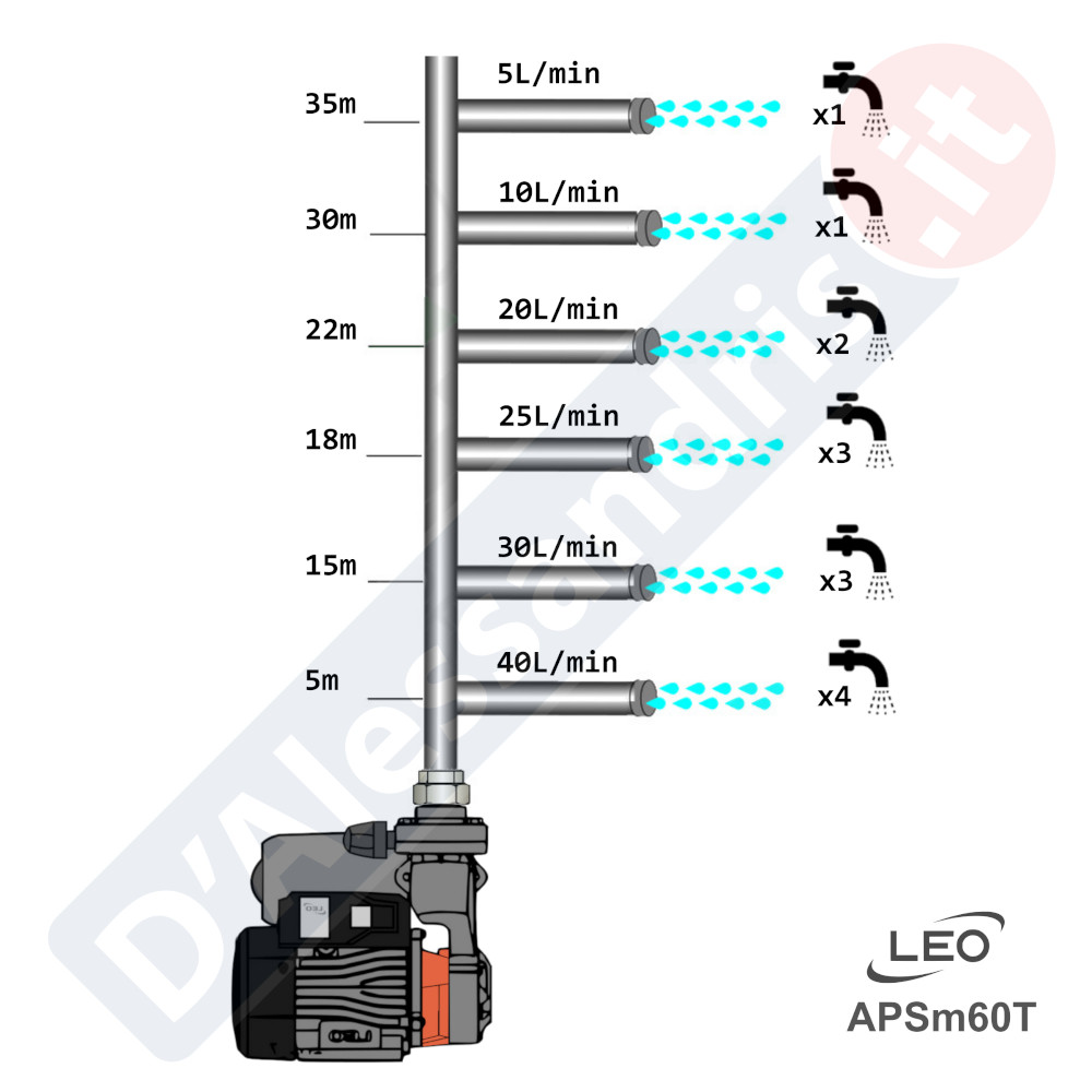 La pompa LEO è la soluzione ideale per risolvere i cali di pressione idrica in un ambiente domestico. Si presenta come un sistema unico, necessita di conoscenze idrauliche basilari e quindi pronto per l’installazione. La pompa per acqua è un sistema autoclave completo, in quanto è composto da una pompa periferica autoadescante associata a sua volta ad un presscontrol elettronico ed un piccolo vaso espansione. Tutti questi componenti garantiscono un sistema sicuro e funzionale, in quanto la pompa grazie alla girante al suo interno riuscirà ad aumentare la pressione dell’acqua in ingresso. Il funzionamento è gestito da un sistema autoadescante, quindi la pompa andrà ad aspirare l’acqua autonomamente anche in presenza di aria nel tubo d’ingresso. L’accensione e lo spegnimento verrà gestito dal controllo di pressione integrato insieme ad un piccolo vaso espansione; quest’ultimo sarà indispensabile per proteggere la pompa da sbalzi di pressione, colpi d’ariete e marcia a secco. La protezione offerta dall’azienda LEO è IPX4, quindi tranquillamente installabile sia al chiuso che all’aperto in ambienti umidi, purché siano ottimamente protetti dalle intemperie esterne. I materiali di costruzione della pompa sono di qualità alta in quanto ghisa e ottone. Ottima cosa da sottolineare è la girante in Ottone installata, e quindi altamente affidabile e funzionale. Per ulteriori informazioni tecniche consultare la scheda tecnica del prodotto.