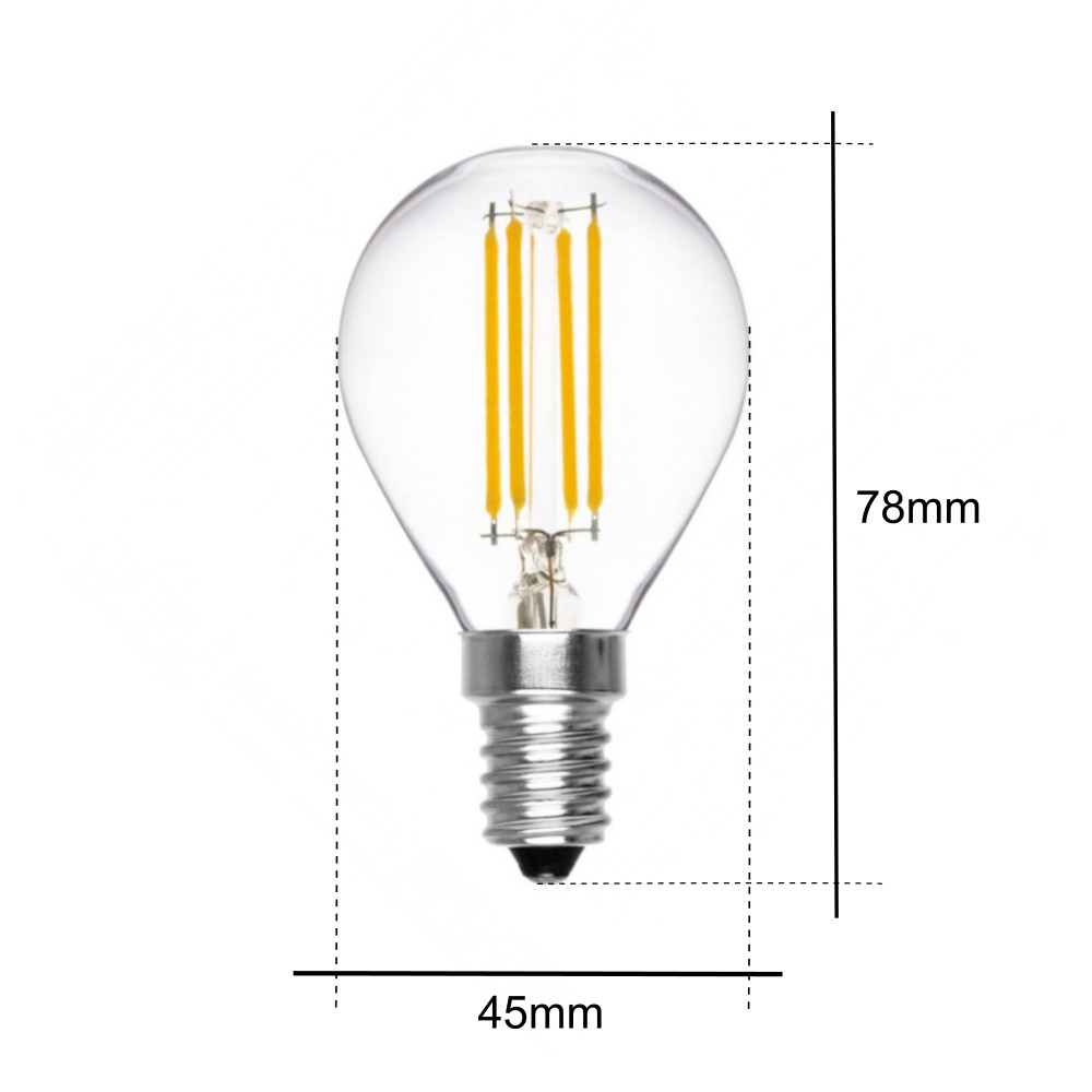 La lampadina a LED illumina gli ambienti con la sua luce bianco caldo. Grazie all’ utilizzo della tecnologia a LED è in grado di assorbire solo 4 W e di produrre 36 W rispetto alla vecchia tecnologia alogena, di conseguenza riesce a garantire un grande risparmio in bolletta. In aggiunta a questo la lampadina rappresenta un’ ottima alternativa alle lampadine ad incandescenza senza rinunciare allo stile vintage. La lampada a bulbo è munita di attacco E14, ideale quindi per lampadari, abat jour e altro. La lampada a filamento ha una forma ad sfera ed una caratteristica copertura in vetro trasparente. È perfetta per ricreare la sensazione delle classiche lampadine ad incandescenza, senza però rinunciare ai vantaggi della tecnologia a LED. La lampadina a sfera produce una luce calda con temperatura colore di 2800 – 3200 K, difatti è perfetta per avere una luce avvolgente e rilassante. Grazie agli elevati lumen prodotti illumina in maniera perfetta i vostri ambienti. La luce emessa dalla lampadina LED E14 ricopre un fascio luminoso di 360°, ed ha un’ elevata intensità, pari a 400 lm. Per via della tecnologia a LED la lampadina è in grado di offrire un’ elevata durata, infatti è in grado di raggiungere fino a 30000 ore di funzionamento. I dati tecnici della lampadina possono variare leggermente.