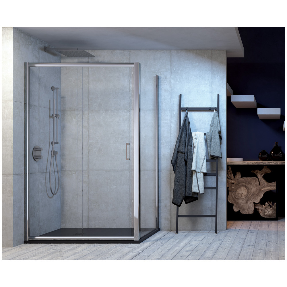 La struttura, robusta e pesante, è completata da un profilo in alluminio con finitura cromo lucido, che conferisce al box doccia un aspetto moderno e raffinato. La finitura in cristallo trasparente aumenta la luminosità del bagno, rendendo lo spazio visivamente più ampio e armonioso.