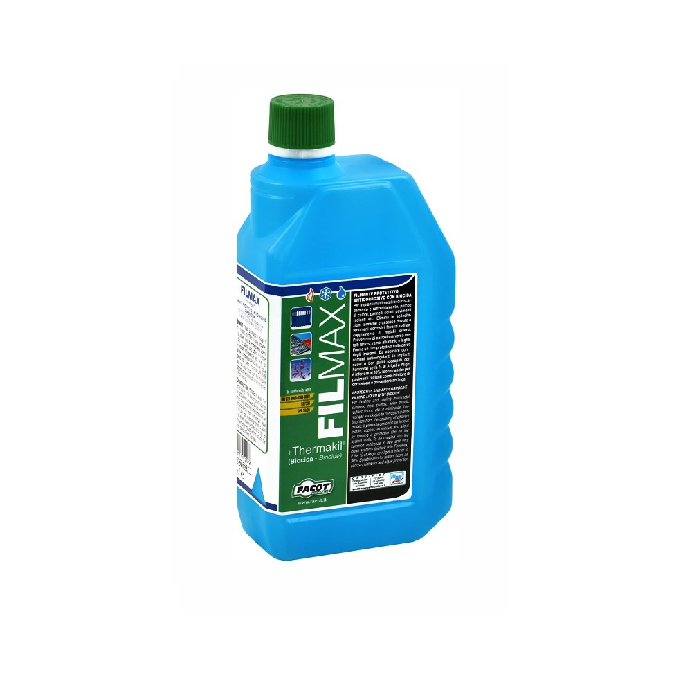 Filmax+Thermakil è un liquido protettivo filmante con azione antincrostante per impianti termici sia tradizionali, che a pannelli radianti. Filmax è compatibile con tutti i metalli e le materie plastiche che compongono un impianto termico. A base di sali inibitori, protegge dall’ossidazione e dalla corrosione i comuni metalli. Forma un film monomolecolare sulle pareti degli impianti, ed elimina le sollecitazioni termiche e gassose dovute all’accoppiamento di metalli diversi. Filmax contiene, inoltre, un efficace biocida in grado di impedire, o comunque ridurre notevolmente, lo sviluppo di alghe e prodotti biologici all’interno dell’impianto. Lo sviluppo incontrollato di alghe o flora batterica crea impedimenti alla regolare circolazione dell’acqua all’interno dell’impianto.