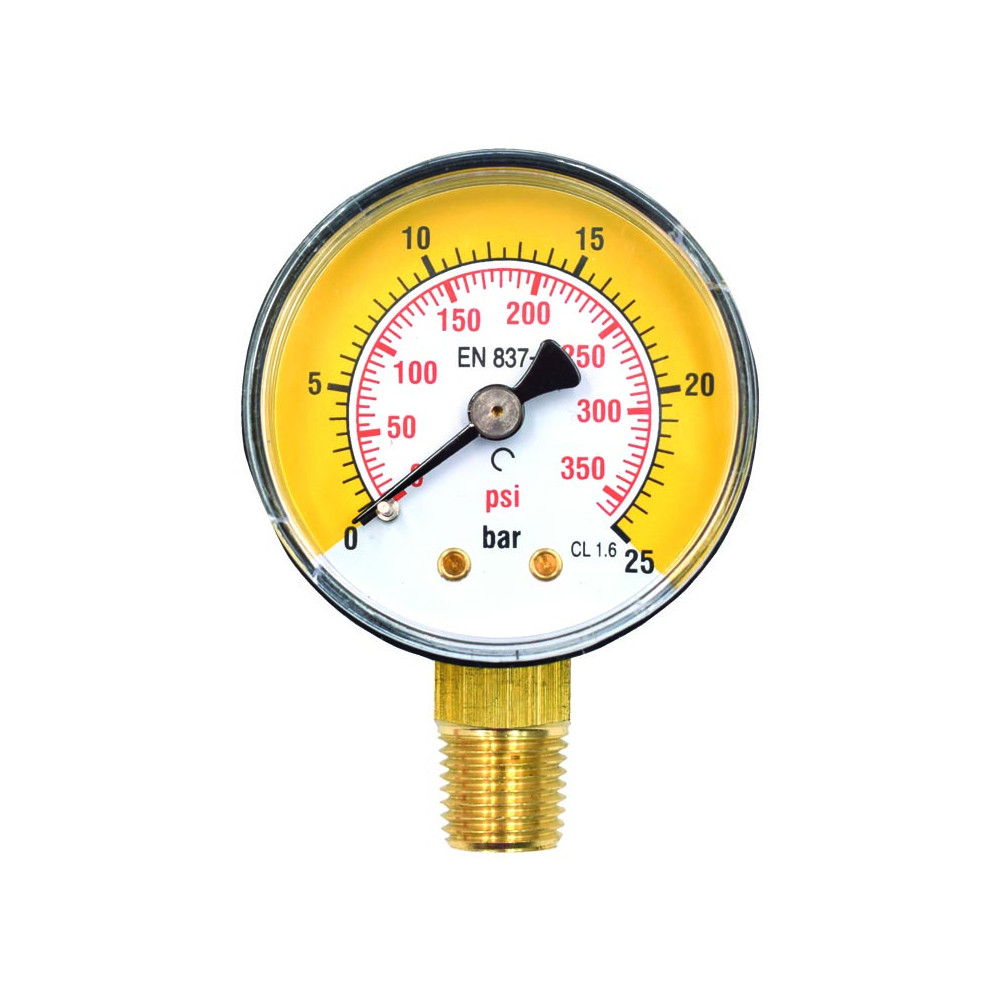 La robustezza e la durabilità del manometro sono garantite dai suoi materiali di alta qualità. La cassa da Ø50mm è realizzata in ABS nero, resistente agli urti e alle sollecitazioni. Mentre l’attacco radiale filettato 1/4″ è in ottone, resistente alla corrosione garantisce affidabilità nelle connessioni. Il componente principale del manometro è un elemento manometrico a molla Bourdon in lega di rame, saldato con lega di stagno per lavorare efficacemente in un ampio intervallo di temperatura, da -20°C a +90°C. Ha un range di misura della pressione da 0 a 25 bar, inoltre presenta una doppia scala di lettura.