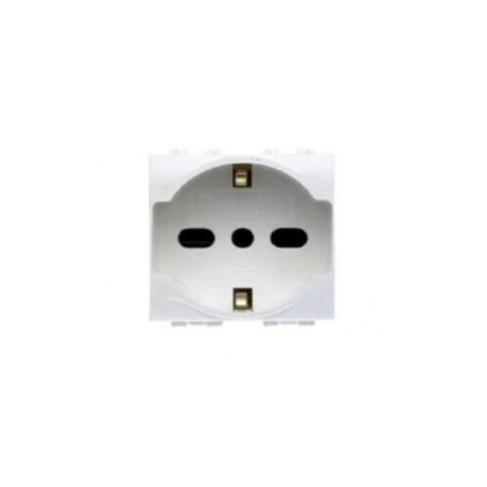 Presa universale 10/16A 2P+T compatibile con di Bticino Magic, ha la possibilità di inserire spine schuko, spine da 10A piccole, spine da 16A grandi. Utilizzata per collegare alla rete la maggior parte di elettrodomestici come forno, climatizzatore, aspirapolvere, frullatore e spine di ogni tipo. Presa standard tedesco e bipasso