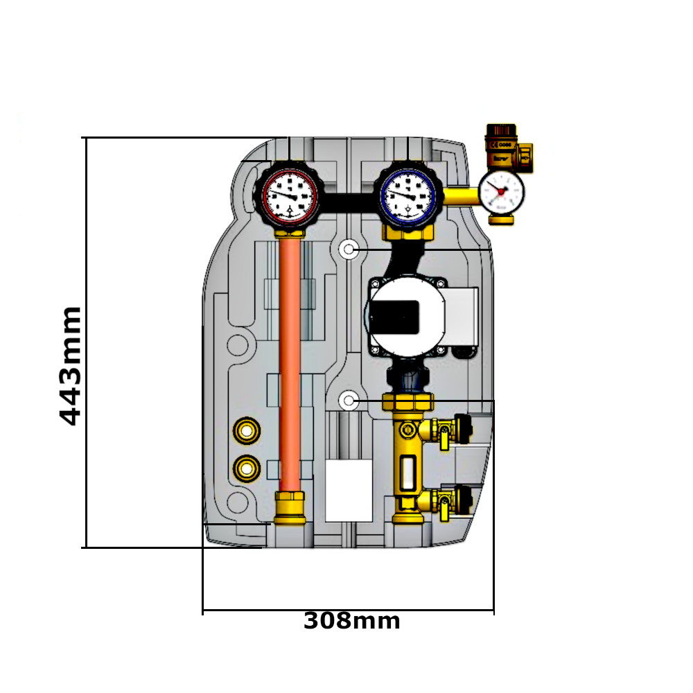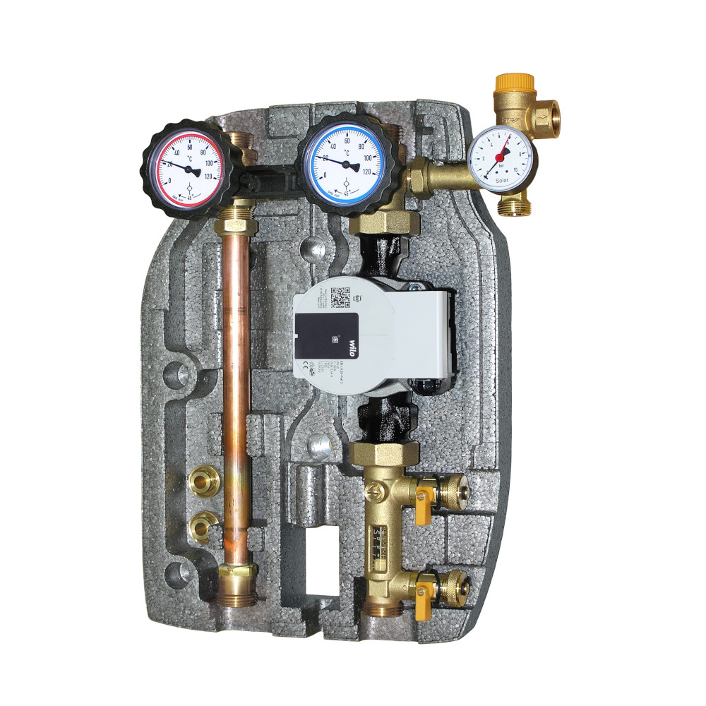 Il sistema è racchiuso in un guscio isolante in PPE grigio, un materiale che riduce le dispersioni termiche e protegge i componenti interni. Al suo interno integra un circolatore, Wilo, ad alta efficienza da 1” con controllo PWM, un gruppo di sicurezza tarato a 6 bar con manometro per il controllo della pressione, un misuratore e regolatore di portata, valvole di carico e scarico e un disaeratore in ottone con valvola di sfiato manuale, utile per eliminare l’aria dal circuito e mantenere alte prestazioni.
