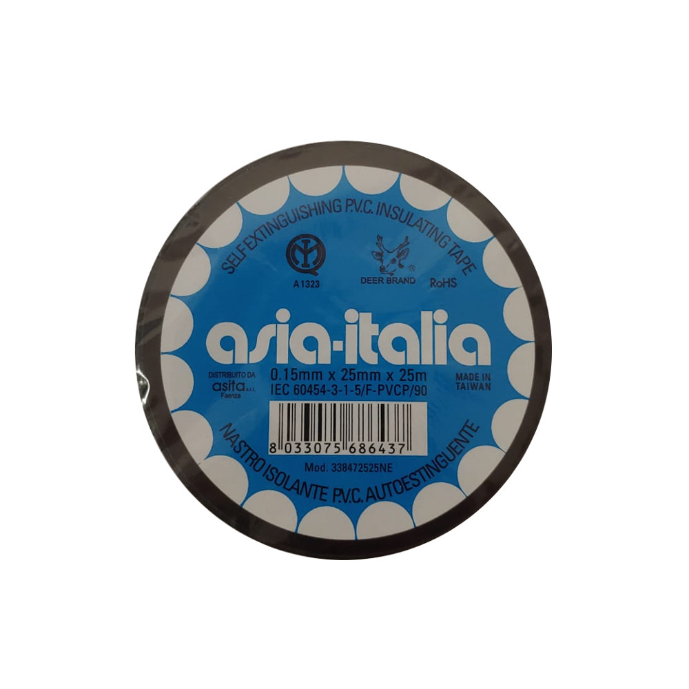Nastro isolante Nero Asita in Pvc 0,15mm x 25mm x 25m. Il nastro ha le seguenti caratteristiche: adesivo ed elastico sia nel periodo invernale che estivo; non si rompe in presenza di basse temperature mantenendo la sua elasticità consentendo all’operatore di tenderlo il più possibile al fine di effettuare fasciature uniformi e prive di bolle d’aria. La qualità di questo nastro viene controllata dal marchio IMQ tramite verifiche di conformità alla norma di prodotto CEI EN 60454