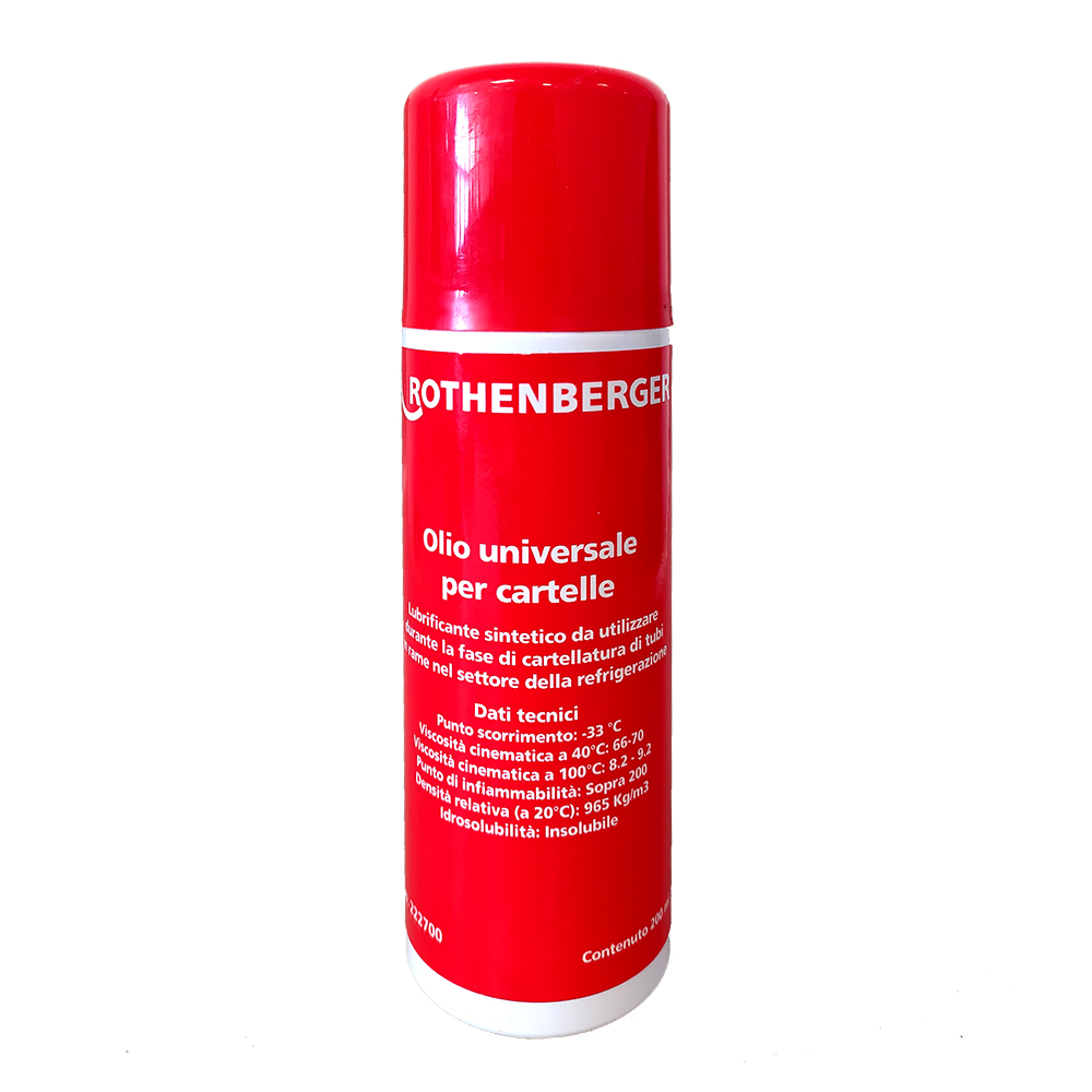 L’ olio universale per cartelle Rothenberger Spray 200ml è un lubrificante sintetico da utilizzare durante la cartellatura dei tubi in rame del condizionamento e della refrigerazione. Rothenberger è un marchio che offre una ampia gamma di prodotti per attrezzatura, soprattutto per i sistemi refrigeranti come quelli del condizionamento. Questo spray da 200 ml è pratico da usare grazie alle dimensioni ridotte della bomboletta. Grazie all’ azione spray l’ olio universale riesce a coprire in modo omogeneo le zone da trattare sui tubi e sulle cartelle. La bomboletta contiene 200 ml di olio universale per cartelle insolubile con erogatore spray.