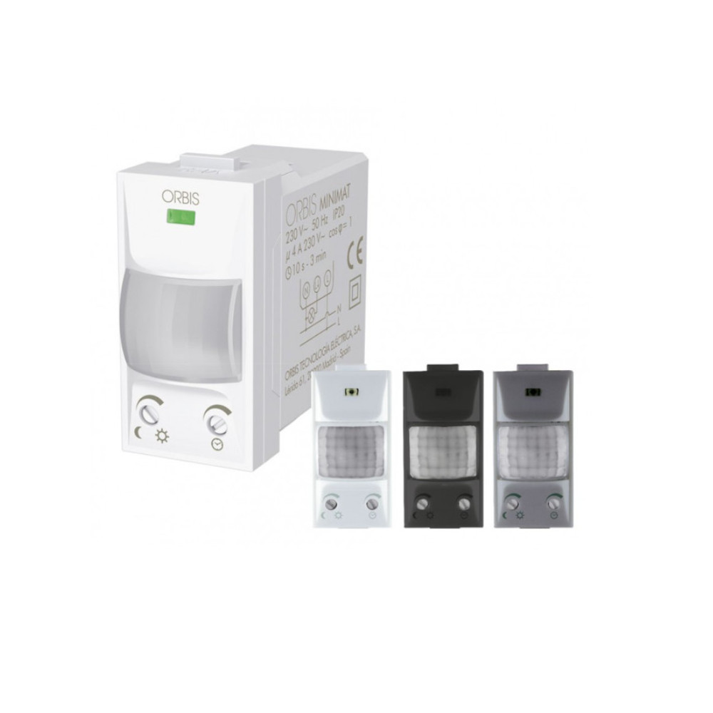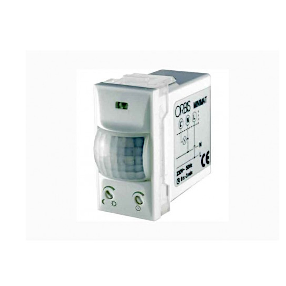 Il rivelatore di presenza incasso 1 modulo OB135312 Minimat della ditta Orbis per serie civili adattabile a Bticino Living, Livinglight, Livinglight Tech, Livinglight Air, Axolute, Matix; Vimar Plana, Eikon, Arkè; Gewiss Chorus; Ave Sistema 44. Per fissare il rilevatore al supporto della serie civile occorre prima applicare al corpo del rilevatore uno dei sette adattatori in dotazione in funzione della marca della serie civile da usare. Il rilevatore di presenza Minimat intercetta le emissioni invisibili provenienti da persone e da altre fonti di calore, chiudendo il circuito di uscita e si apre quando cessa di intercettare il movimento, dopo un lasso di tempo regolabile.