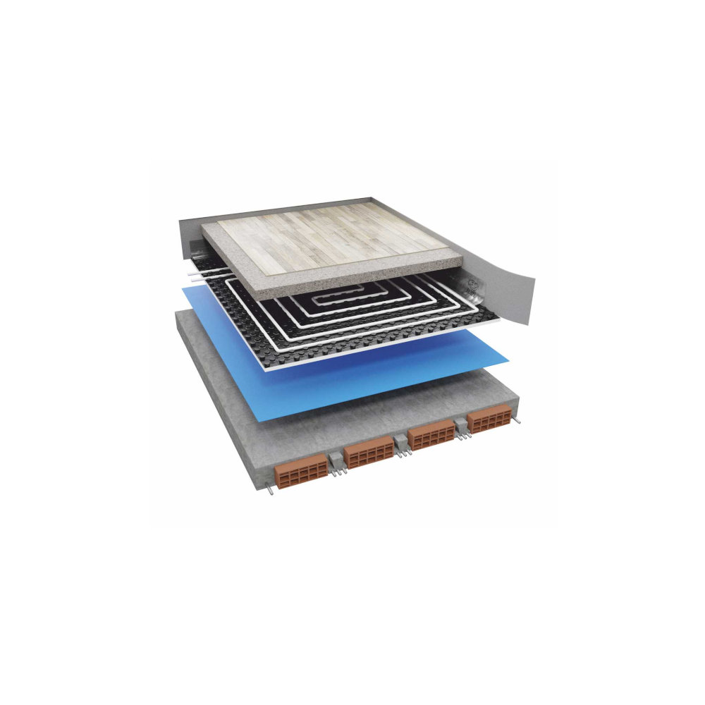 Il pannello è realizzato in EPS, un polistirolo espanso sinterizzato a celle chiuse che garantisce un corretto isolamento termico. Infatti, l’EPS è traspirante e impermeabile all’acqua, la quale non attraversa le pareti delle celle. In aggiunta, la resistenza alla diffusione del vapore previene il fenomeno della condensazione delle pareti. Il sistema è rivestito con un film in poliestere compatto di spessore 0,6mm termoformato di colore nero. Assicura, quindi, elevate prestazioni meccaniche e una funzione di barriera al vapore. Le bugne sono progettate con un importante sottosquadra che garantisce una posa del tubo rapida ed efficace. La sporgenza autobloccante evita l’impiego di clips e velocizza la posa della tubazione. La superficie della lastra presenta un reticolo in rilievo che consente di distanziare il più possibile il tubo dal materiale isolante e aumentare l’area di contatto tra tubo e massetto. Questo consente di ottimizzare la resa termica. Il dentello, accentuato e molto sporgente, permette di trattenere meglio la tubazione. La robustezza meccanica , fornita dal film di poliestere termoformato realizzato con materiali riciclati, assicura un’ottima resistenza al calpestio. Il film è sagomato sui bordi perimetrali in modo tale da consentire un’adeguata sovrapposizione ed un solido aggancio tra pannelli adiacenti, garantendo una tenuta ottimale durante la posa dei pannelli ed il getto del massetto.
