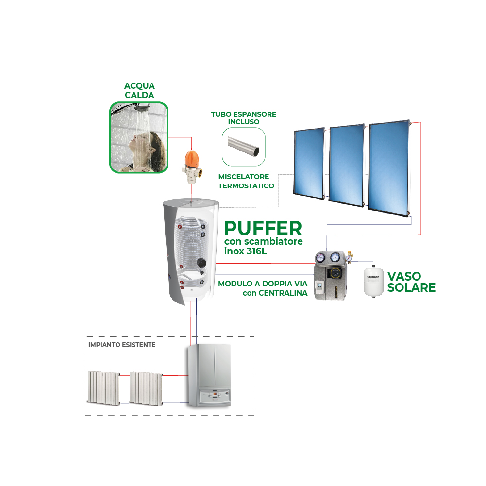 Il sistema solare PUF 300 Plus di Idaltermo è un utile kit per la produzione gratis di acqua calda sanitaria e per un notevole risparmio sui costi dell’energia direttamente in bolletta. Questo set solare è a circolazione forzata con 2 collettori e boiler da 300 lt con accumulo. Il puffer ha lo scambiatore in acciaio inox 316L. I collettori del sistema sono 2 pannelli solari per una superficie captante di 5 mq circa. PUF 300 Plus di Idaltermo ha uno speciale modulo a doppia via con centralina incorporata ed è dotato di struttura in alluminio anodizzato, più zavorre che evitano la foratura del solaio e viteria in acciao antiruggine. Il sistema comprende il vaso solare e tubo espansore. Il serbatoio del bollitore è di 300 lt. Nel set è incluso un miscelatore termostatico antiscottatura ed il kit di resistenza elettrica. In aggiunta il Puffer solare Idaltermo è fornito con una tanica da 20 lt di liquido solare antigelo puro e la viteria in acciaio inossidabile. Un installatore qualificato può montarlo facilmente e velocemente. Lo spazio dell’intero sistema è di 250 cm di larghezza e una profondità di 250 cm per soli 149 cm di altezza. Tra l’altro si può integrare Puf 300 Plus ad una caldaia esistente. Idaltermo è un marchio di garanzia nel solare termico soprattutto con i sistemi solari per acqua calda sanitaria sia a circolazione naturale che quella a circolazione forzata. Inoltre installando un pannello solare si ha la possibilità di risparmiare sul prezzo in fattura e di ottenere agevolazioni fiscali. Con rimborso GSE del Conto Termico per abitazioni di 75 mq minimo e Bonus Casa ed EcoBonus anche con nuove installazioni. Installare un sistema solare è molto conveniente in quanto si risparmia sulle bollette delle utenze domestiche perchè si utilizza l’energia gratuita del sole.