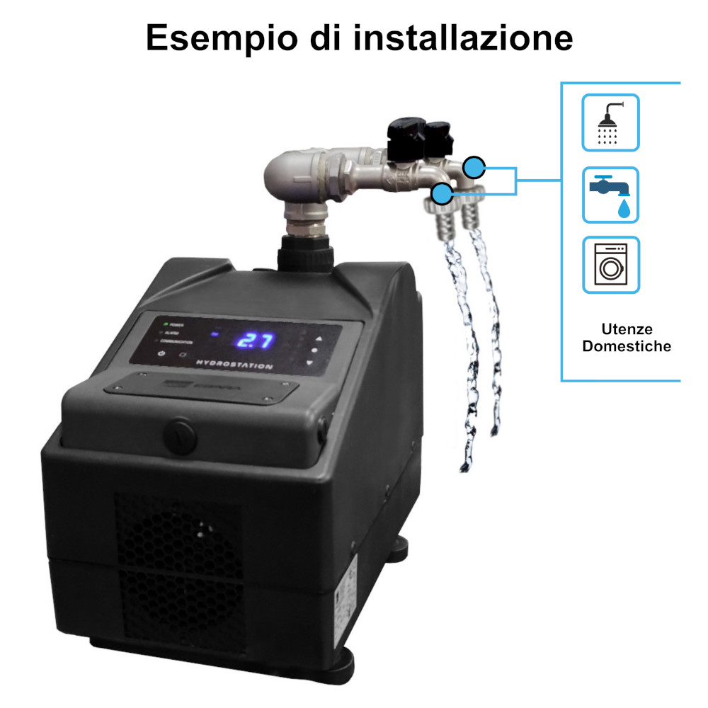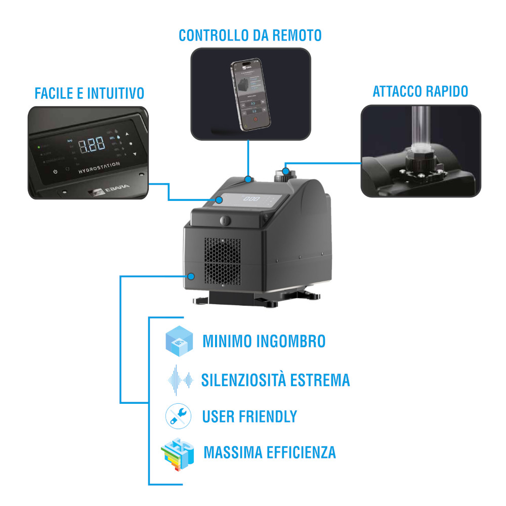La pompa Hydrostation è un prodotto estremamente silenzioso, difatti oltre al notevole risparmio energetico riesce ad essere un prodotto notevolmente silenzioso con i suoi soli 43 decibel prodotti. Questa caratteristica consente alla pompa di essere posizionata ovunque, anche in ambienti abitati, come possono essere la cucina, il giardino o simili. Per di più grazie alla connettività Bluetooth è possibile programmare e monitorare il sistema da app senza l’accesso diretto alla stazione. Ideale per installazioni in spazi ristretti o difficilmente accessibili.