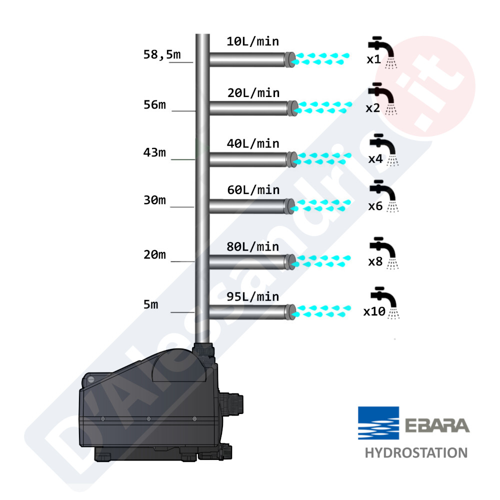 L’elettropompa Hydrostation si alimenta con una tensione monofase 230V, ha una potenza in cavalli di 1.00hp ed un assorbimento di 0,80kW. Garantisce una portata massima di 95l/min ad un’altezza di 5 metri, una portata minima 10l/min ad un’altezza di 58,5 metri, e la temperatura del liquido da pompare va da +5°c a +45°C. Idonea anche al trasporto di acqua potabile secondo decreto ministeriale nr. 174/2004 . Il grado di protezione è IP65, quindi completamente protetto contro l’ingresso di polvere e i getti d’acqua. Pertanto può essere utilizzata all’esterno o in ambienti umidi come i bagni, senza problemi.