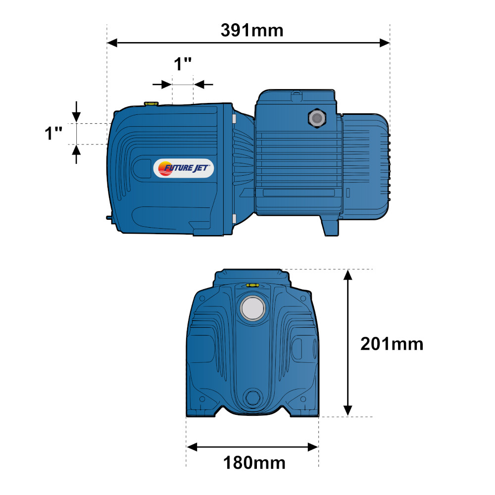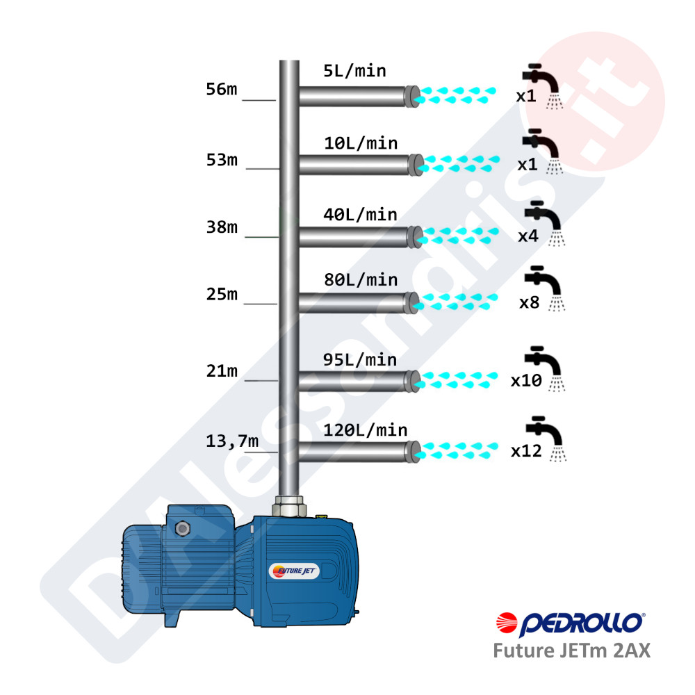 Le prestazioni del modello Future JETm 2AX promettono una potenza in cavalli da 1,25hp, una potenza assorbita di 0,90kw ed una tensione di alimentazione monofase a 230V. Garantisce una portata massima di 120l/min ad un’altezza di 13,7 metri, una portata minima 5l/min ad un’altezza di 56 metri, e la massima temperatura del liquido di pompaggio supportata è di 40°C.