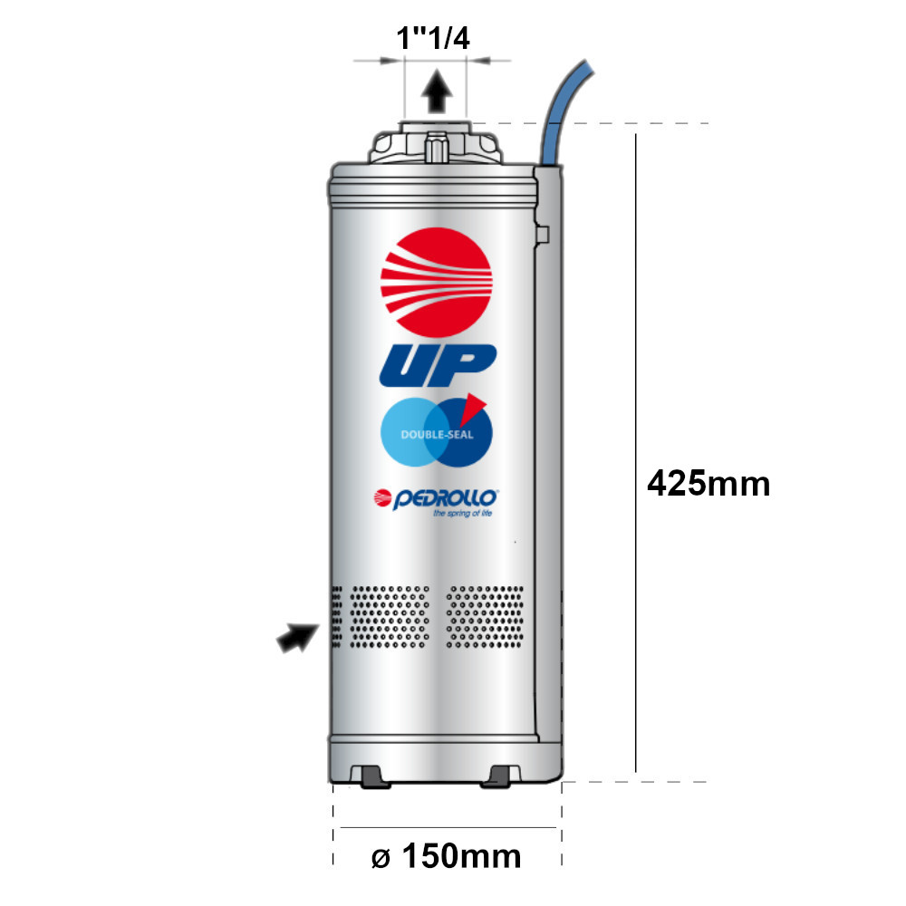 La pompa fa parte della famiglia sommersa multigirante ed internamente possiede più parti mobili nel corpo pompa detta giranti, esse girando aspirano l’acqua dal lato attraverso i piccoli fori e grazie al loro movimento trasferiscono all’acqua l’energia generata dal loro movimento aumentando la pressione dell’acqua per poi farla uscire dalla bocca d’uscita. La pompa UPm 4/3 ha una potenza in cavalli di 0.75 Hp, può pompare un liquidi con temperatura fino a +40 °C purchè abbia un contenuto di sabbia massimo di 150 g/m³. I materiali utilizzati sono l’acciaio INOX 304 per la camicia esterna, camicia motore, diaframmi e albero motore, mentre le giranti sono in Noryl. I materiali sono particolarmente indicati per il corretto ed affidabile utilizzato dell’elettropompa, garantendo ottimo funzionamento e lunga durata nel tempo. La protezione offerta è IPX8, quindi può immersa completamente nel liquido da pompare.