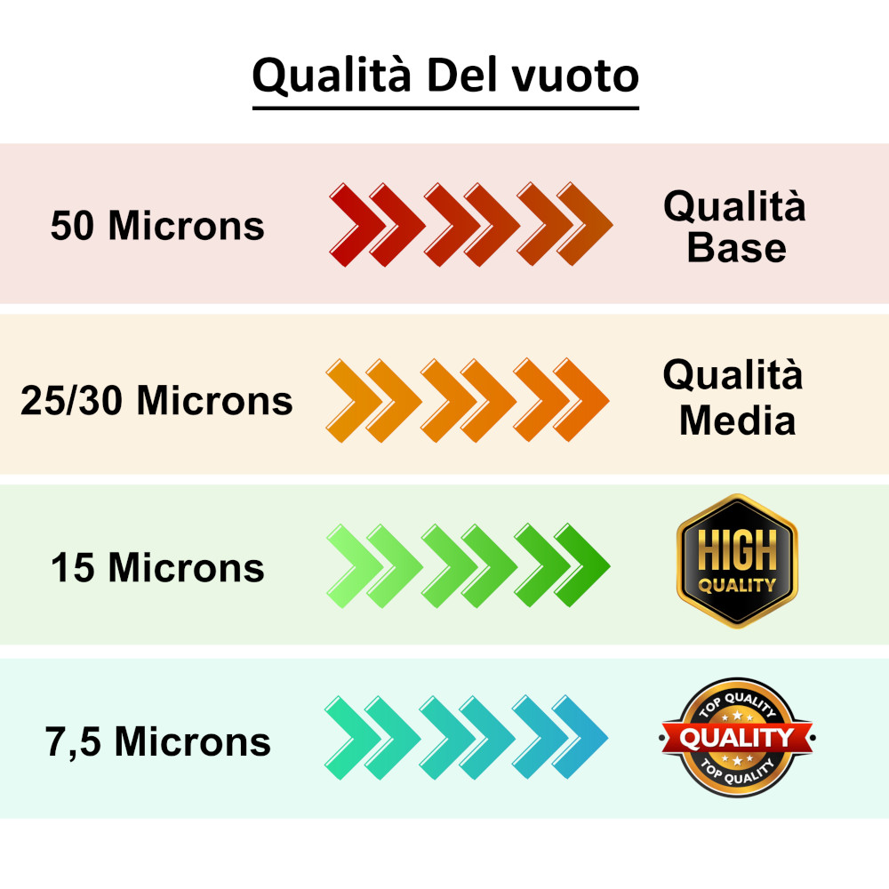 La pompa Ferrari è a doppio stadio, quindi garantisce un vuoto più profondo ed una maggiore capacità di aspirazione, riducendo il tempo necessario per raggiungere il vuoto ideale. Il gas viene prima estratto in uno stadio e poi ulteriormente compresso ed estratto in un secondo stadio. E’ dotata di elettrovalvola che permette di automatizzare il processo di svuotamento, migliorando la sicurezza durante l’uso. Inoltre, chiude automaticamente il circuito una volta interrotta l’alimentazione elettrica alla pompa. Mentre il vacuometro permette di monitorare il livello di vuoto in tempo reale, per un controllo preciso ed affidabile. Oltretutto, se il valore del vuoto sale dopo aver spento la pompa, indica la presenza di una perdita o di umidità residua. La pompa è facile da maneggiare e trasportare grazie al suo design ergonomico e alla struttura resistente. E’ dotata di una robusta struttura in acciaio inossidabile, un materiale resistente e durevole.