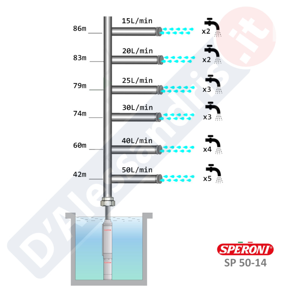 La linea di pompe sommerse Speroni è studiata e progettata per essere composta da due parti indipendenti, difatti motore e girante sono due corpi separati. Questa scelta garantisce un’estrema semplicità nelle manovre di assemblaggio, manutenzione e montaggio del sistema. La pompa sommersa Speroni SP 50 14 viene fornita completa di girante e motore, i quali vanno accoppiati utilizzando l’attacco NEMA per formare una pompa sommersa completa da 4″. Si alimenta con una tensione monofase 230V ed ha una potenza di 1,00hp, quindi è la scelta perfetta svariate esigenze.