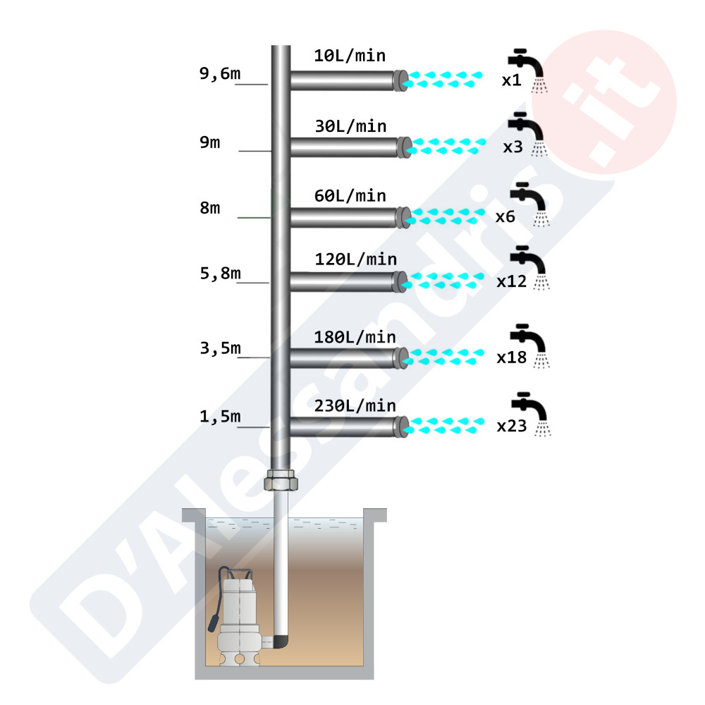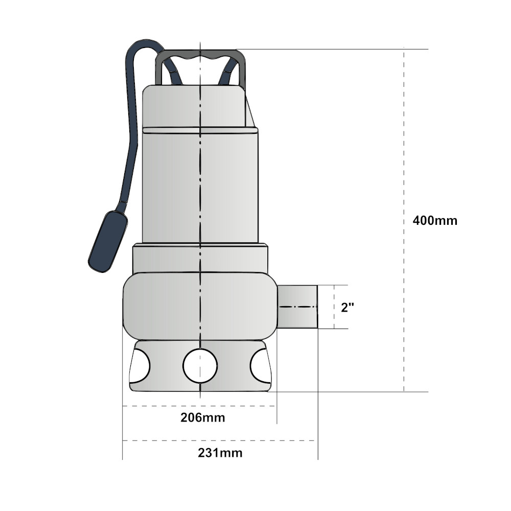 La pompa sommergibile deve essere alimentata con tensione monofase (230 V). E’ dotata di cavo da 10 metri. Ha una potenza in watt di 750 W in P2, che corrisponde ad una potenza in cavalli di 1,00hp. La temperatura massima del liquido da pompare è di +35 °C. Per di più è in grado di aspirare ad un livello minimo 35mm e può essere immersa fino a 5 metri.