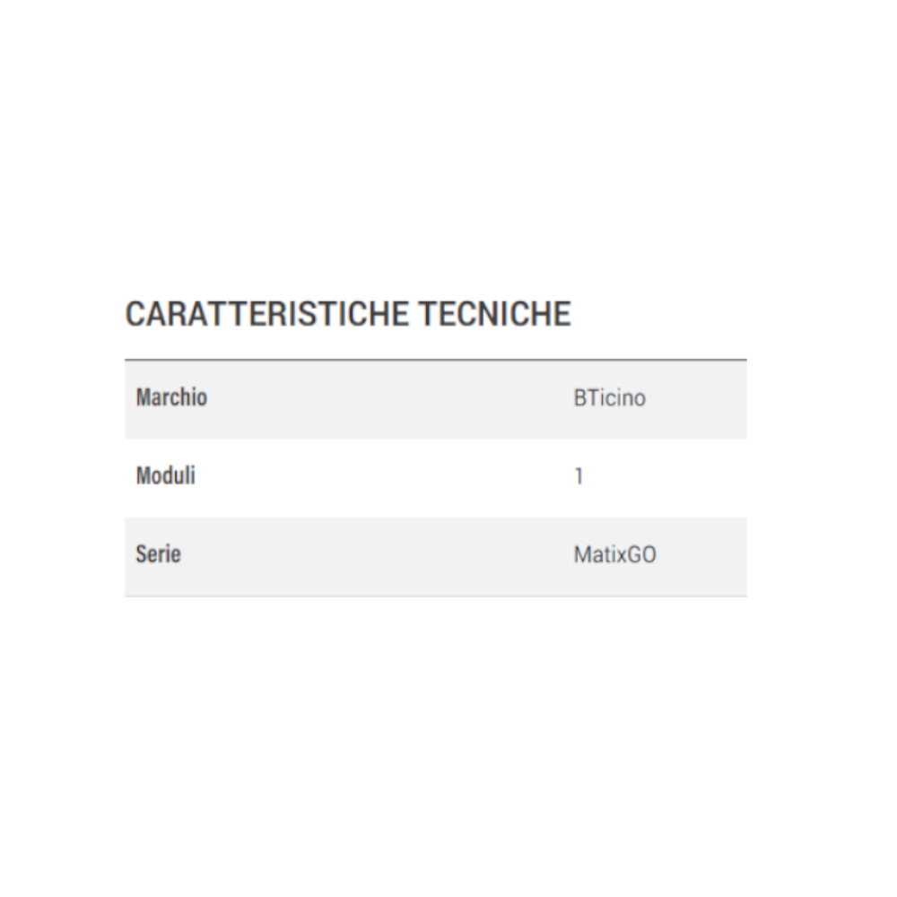 MatixGO è una linea del brand Bticino, un’azienda italiana leader nella progettazione e produzione di soluzioni per le infrastrutture elettriche e digitali nel residenziale, terziario e industriale. Un’azienda sempre all’avanguardia che propone ai suoi clienti soluzioni innovative ma allo stesso tempo di design. La presa MatixGO è conforme agli elementi principali degli obbiettivi di sicurezza della Direttiva Europea Bassa Tensione: 2014/35/UE: 26 Febbraio 2014; alle prescrizioni di protezione essenziali di compatibilità elettromagnetica secondo la Direttiva Europea 2014/30/UE: 26 Febbraio 2014; alla 1995/5/CE: 9 Marzo 1999 « R&TTE ». Conformemente alla 2014/53/UE: 16 Aprile 2014 « RED ». I prodotti della BTicino sono conformi alle prescrizioni delle norme pubblicate dalla Commissione Elettrotecnica Internazionale (IEC). La conformità può essere provata con certificati rilasciati da organismi riconosciuti dalla IEC secondo lo schema CB.