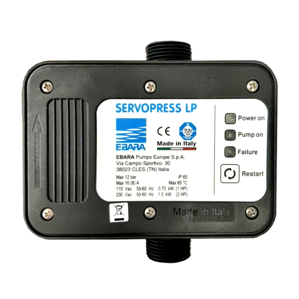 Il presscontrol ServoPress serve ad accendere e spegnere l’elettropompa in maniera del tutto automatica. Il PressControl garantisce un ottimo controllo automatico elettronico della vostra elettropompa fino a 2,00hp. Ebara presenta questo prodotto come una delle migliori soluzioni per controllare la pressione dell’acqua emanata grazie al loro sistema Made In Italy. La taratura del presscontrol è di 1,5 bar, questo valore determina la partenza automatica della pompa mantenendo in pressione l’impianto.
