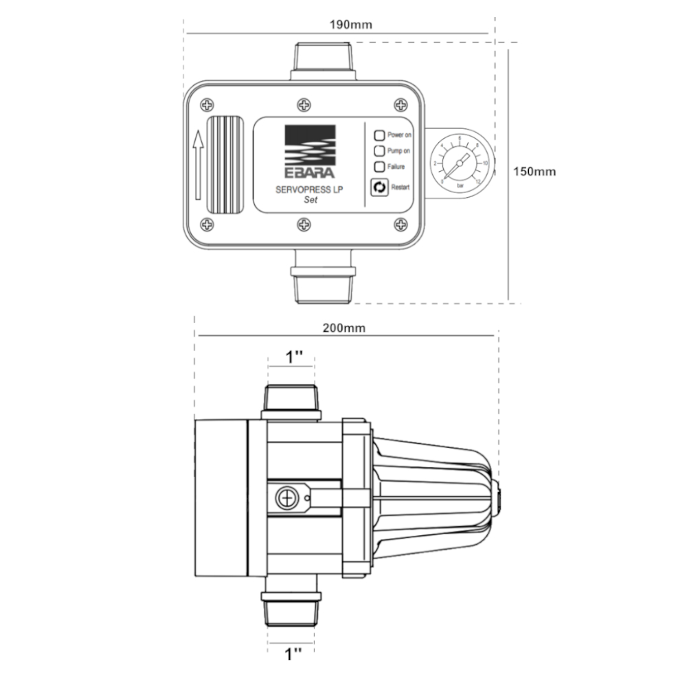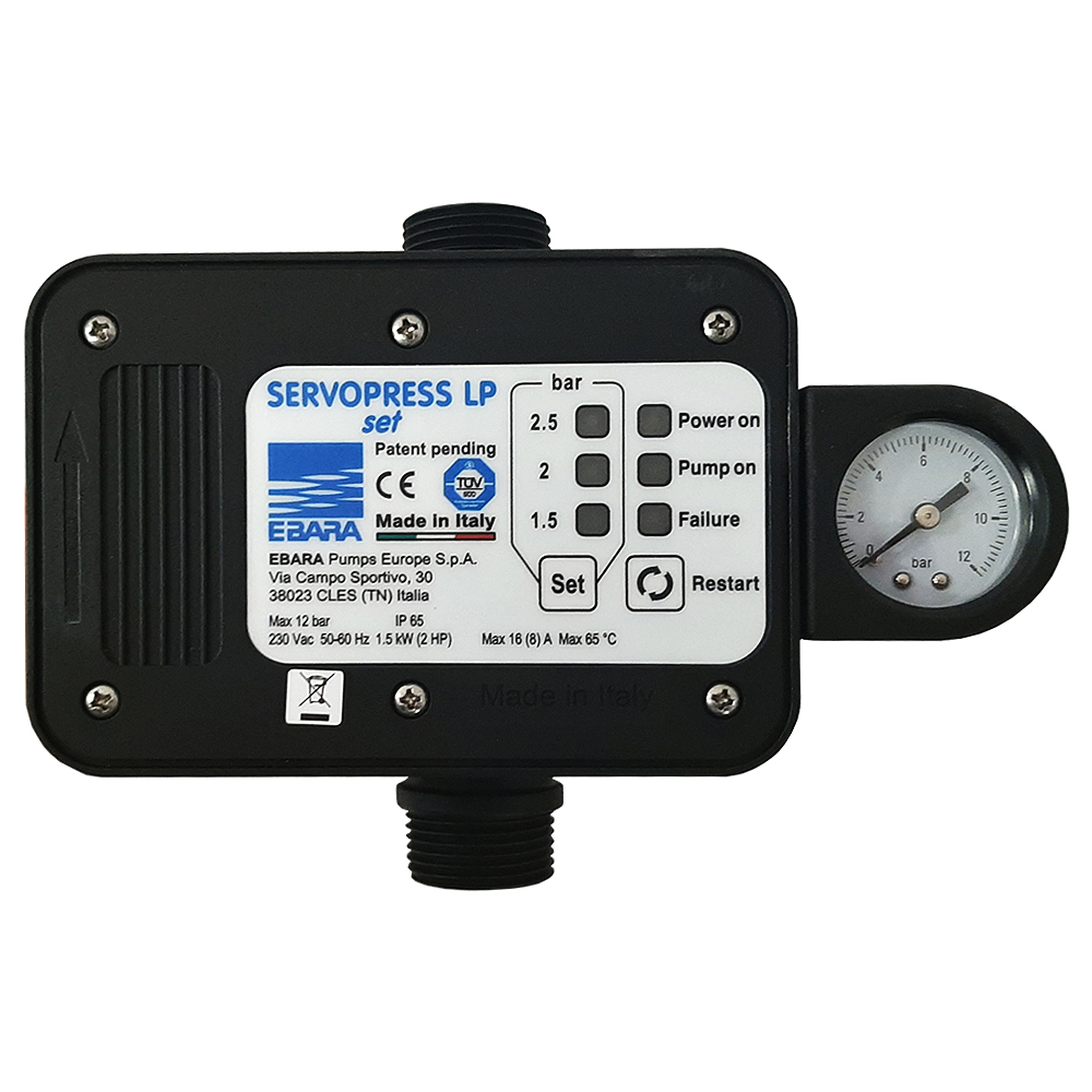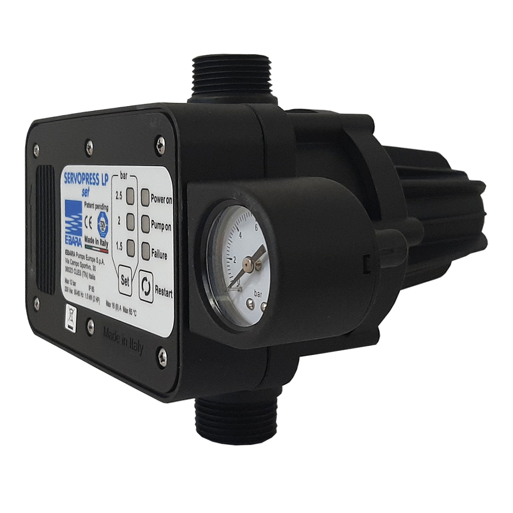 Il presscontrol ServoPress serve ad accendere e spegnere l’elettropompa in maniera del tutto automatica. Il PressControl garantisce un ottimo controllo automatico elettronico della vostra elettropompa fino a 2,00hp. Ebara presenta questo prodotto come una delle migliori soluzioni per controllare la pressione dell’acqua emanata grazie al loro sistema Made In Italy. La taratura del presscontrol è regolabile a 1,5 bar, 2 bar o 2,5 bar in base alle vostre esigenze. Questo valore determina la partenza automatica della pompa mantenendo in pressione l’impianto.