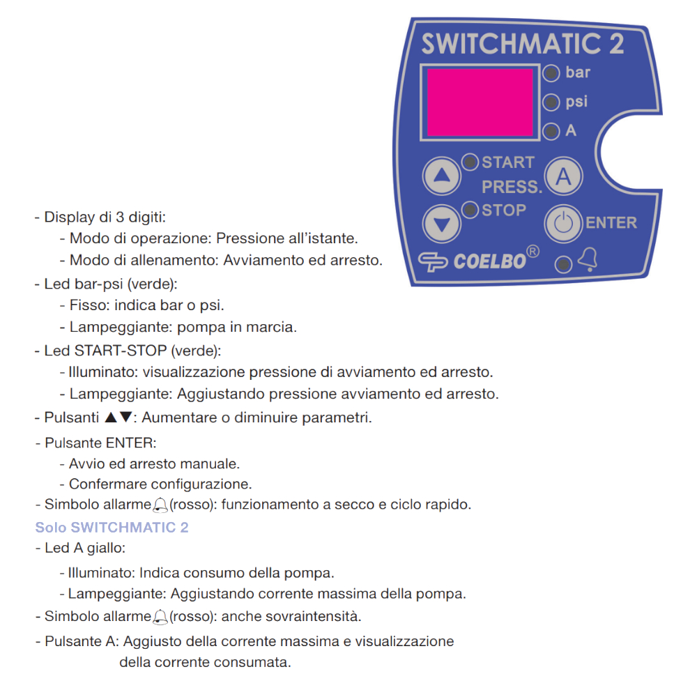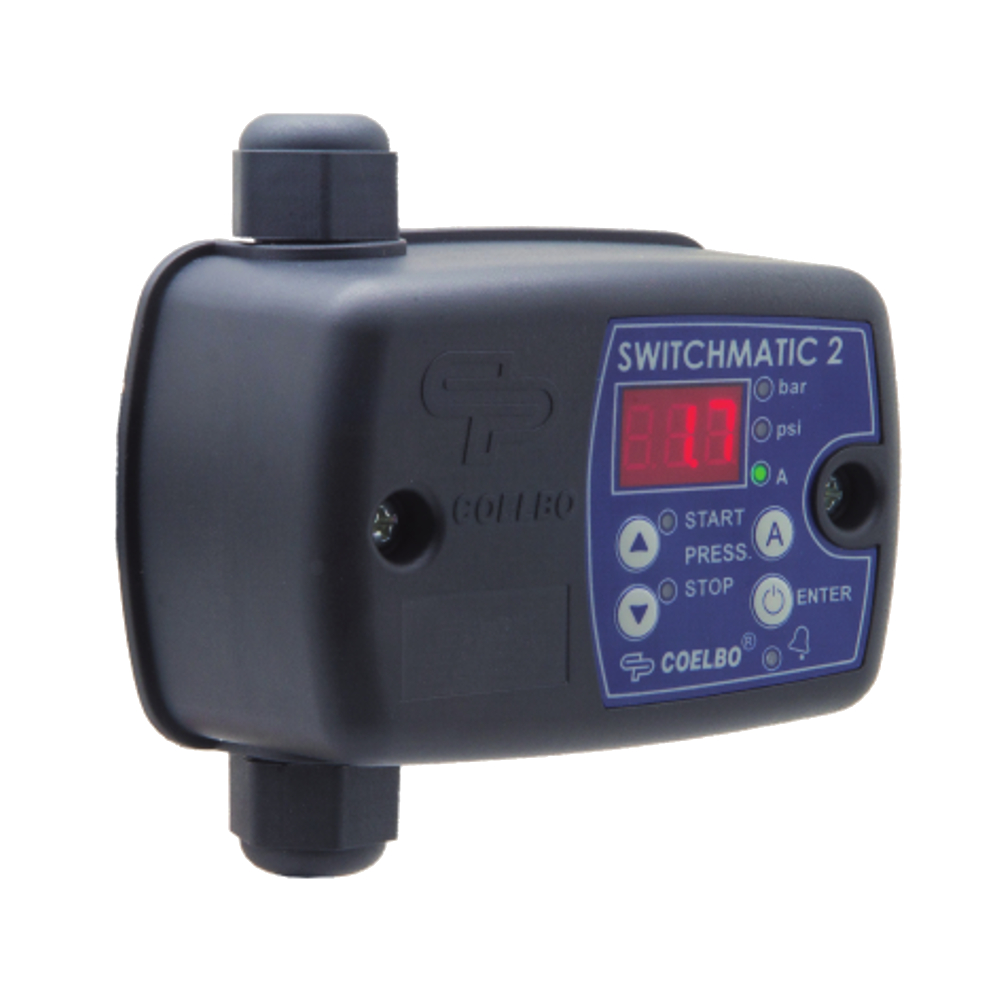 Il pressostato elettronico SwitchMatic 2 è la soluzione perfetta per porre fine ai vostri problemi di pressione e regolazione del vostro impianto. La sua funzione è di accendere e spegnere la vostra elettropompa ad una pressione precisa che va da 1 a 8 bar per l’arresto e da 0,5 ÷ 7 bar per l’avviamento. Tutte le sue regolazioni e impostazioni vengono effettuare tramite semplice pannello di controllo posto sul fronte del presscontrol. Il montaggio è molto semplice in quanto basta avvitare il pressostato ad una semplice tes a 5 vie inclusa ad esempio di manometro e altri accessori, per poi effettuare il cablaggio. Questo si fa in modo analogo a quello di un pressostato come square D tradizionale. Tra le sue caratteristiche funzionali più importanti troviamo il modo stand-by, che garantisce un basso consumo di potenza, manometro interno con indicatore digitale, funzione ART (Automatic Reset Test) dove il dispositivo va a spegnersi in caso di mancanza d’acqua, andrà poi a controllare con una periodicità programmata se l’acqua è presente e solo in quel caso il pressostato riprenderà il suo lavoro e l’allarme di ciclo rapido: quando il serbatoio idropneumatico ha perso aria e si producono frequenti arresti ed avvii, si attiva un allarme. Rispetto al modello precedente offre la protezione contro funzionamento a secco, Protezione contro sovraintensità e u scita allarme a potenziale zero.