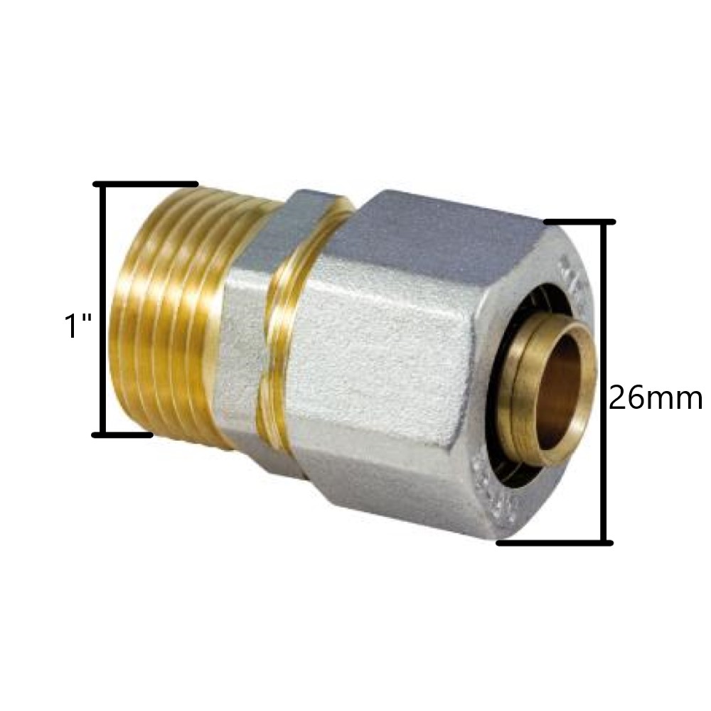 Il raccordo in ottone giallo pesante è utilizzato per collegare due tubi in impianti di riscaldamento, raffrescamento, impianti di acqua sia calda che fredda, aria compressa e in ogni installazione idraulica, commerciale, domestica, industriale ed agricola. Inoltre il raccordo in ottone giallo pesante è idoneo per il trasporto di acqua potabile. Il raccordo dritto a stringere è utilizzato per il collegamento di un tubo multistrato, inoltre è idoneo per il collegamento di un tubo in polietilene. Il raccordo dritto ha un attacco maschio con filettatura 1″ e un attacco maschio con diametro Ø26mm.  La filettatura del raccordo, più lunga e più liscia, permette al tubo di scorrere meglio ed è conforme alla norma UNI EN ISO 228-1:2003.