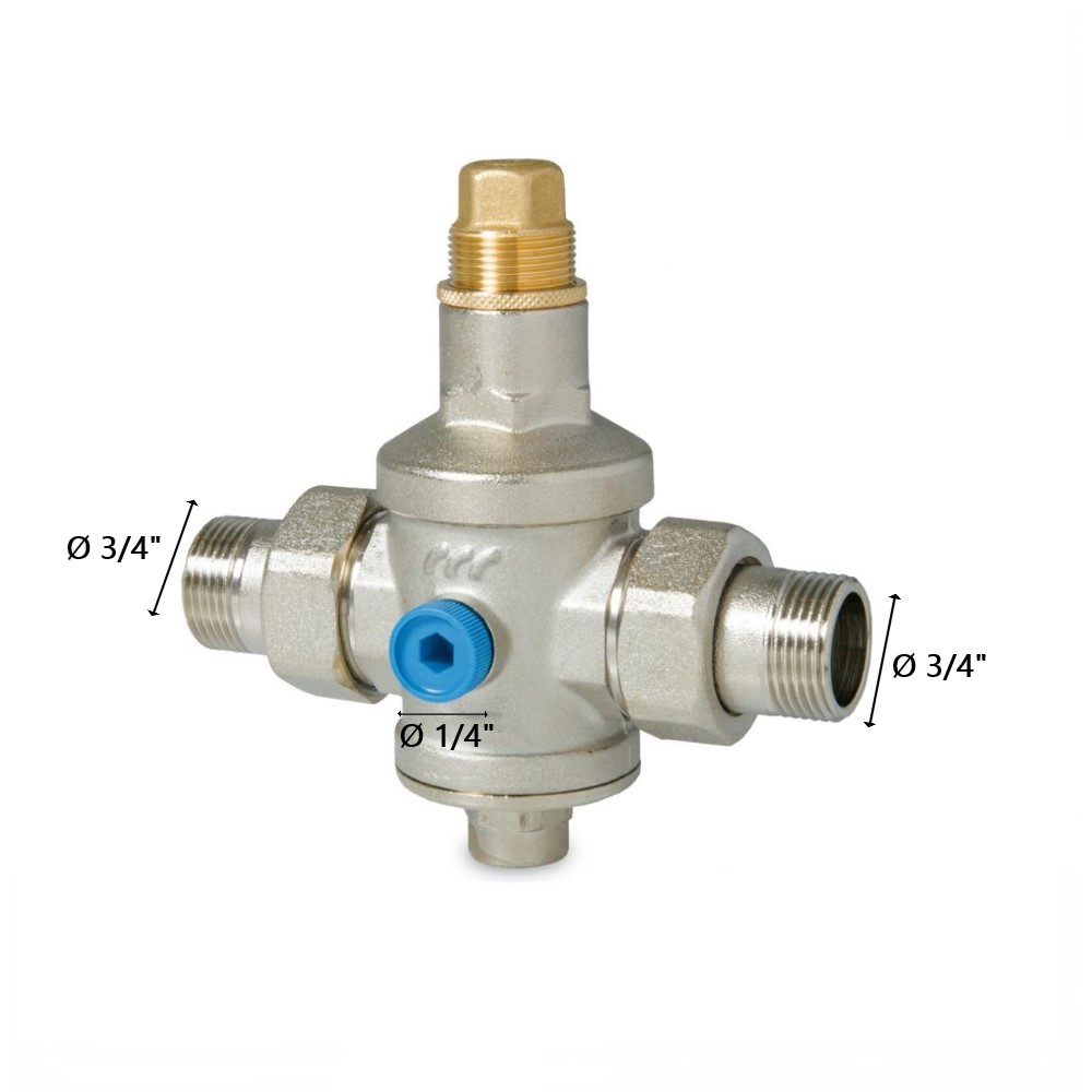 Regolatore di pressione per acqua potabile Ø 3/4″. I riduttori di pressione sono dispositivi che riducono e stabilizzano la pressione in entrata dalla rete idrica. Solitamente tale pressione risulta troppo elevata e variabile per essere sfruttata correttamente in un impianto domestico. Una delle caratteristiche principali di un riduttore è quella di riuscire a mantenere costante questa pressione. Il riduttore di pressione pesante F.A.R.G. è indicato particolarmente in impianti in cui si richiedono portate medio-alte, con la garanzia della sede di tenuta in acciaio inossidabile. Caratteristica principale è il funzionamento a pistone con camera di compensazione. Gli attacchi per il collegamento all’impianto sono a bocchettone maschio filettati secondo la norma ISO 228/1. Due attacchi da 1/4″G, posti sul corpo, permettono il collegamento di un manometro di controllo. Il riduttore di pressione è collaudato e tarato ad una pressione di uscita di 3 bar. Pressione massima d’esercizio consigliata 25 bar. Temperatura massima di utilizzo 120°. F.A.R.G. srl produzione interamente “Made in Italy”.