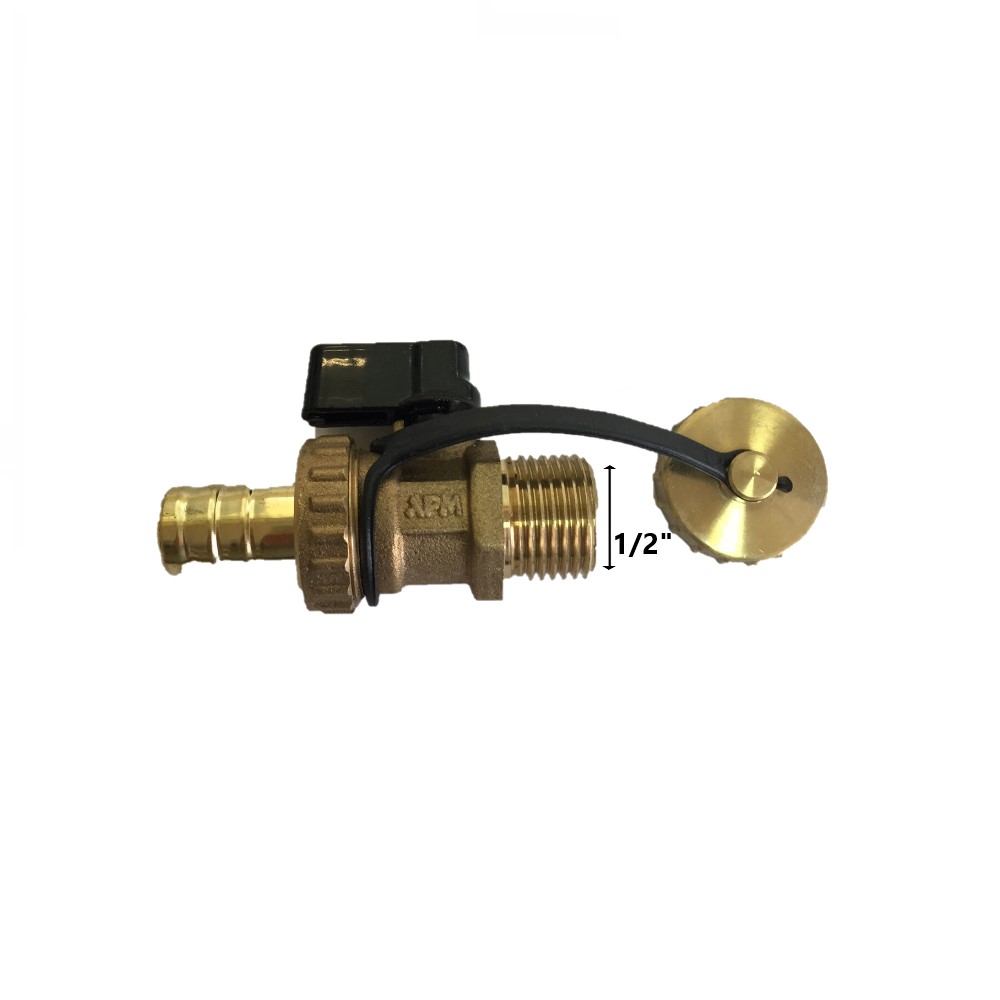 Rubinetto a sfera per scarico caldaia in ottone con portagomma e tappo Ø 1/2″. Leva in alluminio nera.