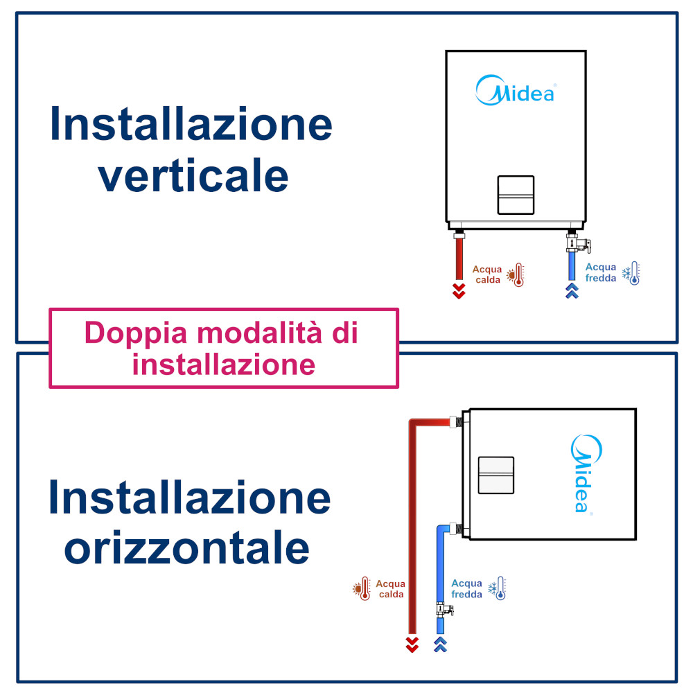 Lo scaldabagno Midea è progettato con una struttura un terzo più sottile, rispetto ai modelli tradizionali. Difatti permette un’installazione sia in verticale che in orizzontale, adattandosi perfettamente anche a spazi ristretti.