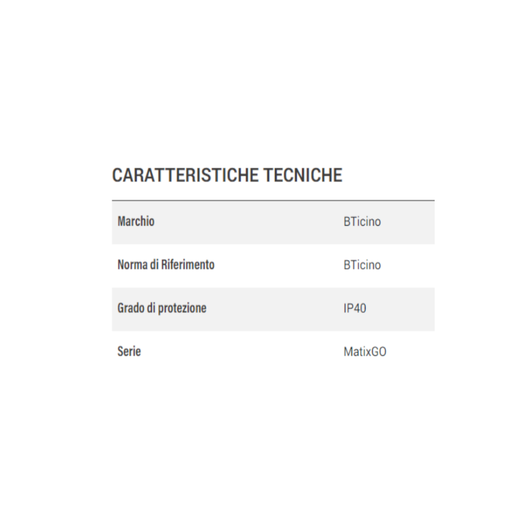 MatixGO è una linea del brand BTicino, un’azienda italiana leader nella progettazione e produzione di soluzioni per le infrastrutture elettriche e digitali nel residenziale, terziario e industriale. Un’azienda sempre all’avanguardia che propone ai suoi clienti soluzioni innovative ma allo stesso tempo di design. La scatola MatixGO è conforme alla Direttiva Europea Bassa Tensione: 2014/35/UE: 26 Febbraio 2014; alla Direttiva Europea 2014/30/UE: 26 Febbraio 2014; ed alla 1995/5/CE: 9 Marzo 1999 « R&TTE ». Conformemente alla 2014/53/UE: 16 Aprile 2014 « RED ». I prodotti della BTicino sono conformi alle prescrizioni delle norme pubblicate dalla Commissione Elettrotecnica Internazionale. La conformità può essere provata con certificati rilasciati da organismi riconosciuti dalla IEC secondo lo schema CB.