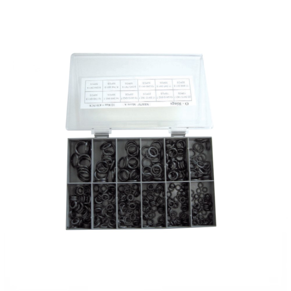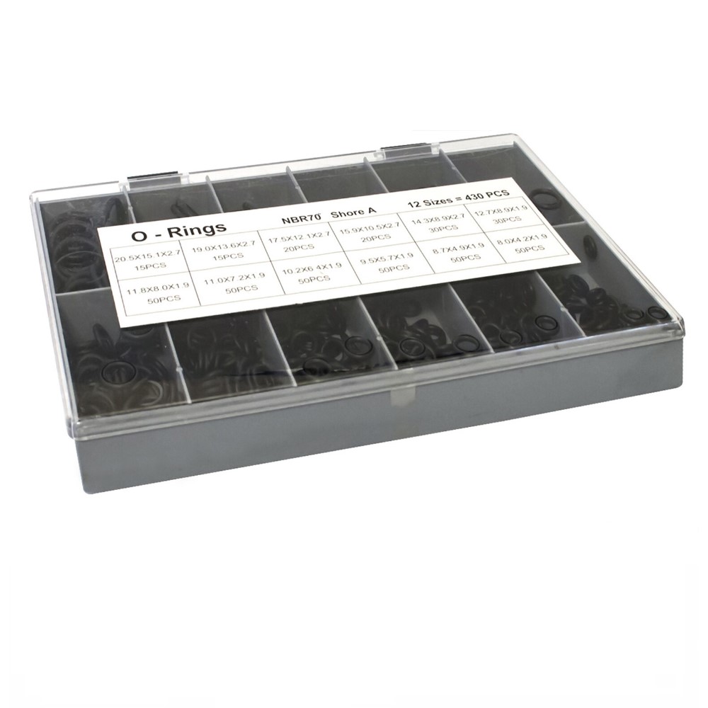 Assortimento guarnizioni tipo o-ring. Kit composto da 430 pezzi divisi in 12 misure diverse forniti in un pratico porta minuteria con coperchio trasparente. Misure: OR 3 – OR 4 – OR 5 – OR 5A – OR 6 – OR 6A – OR 7 – OR 8 – OR 9 – OR 10 – OR 11 – OR 12.