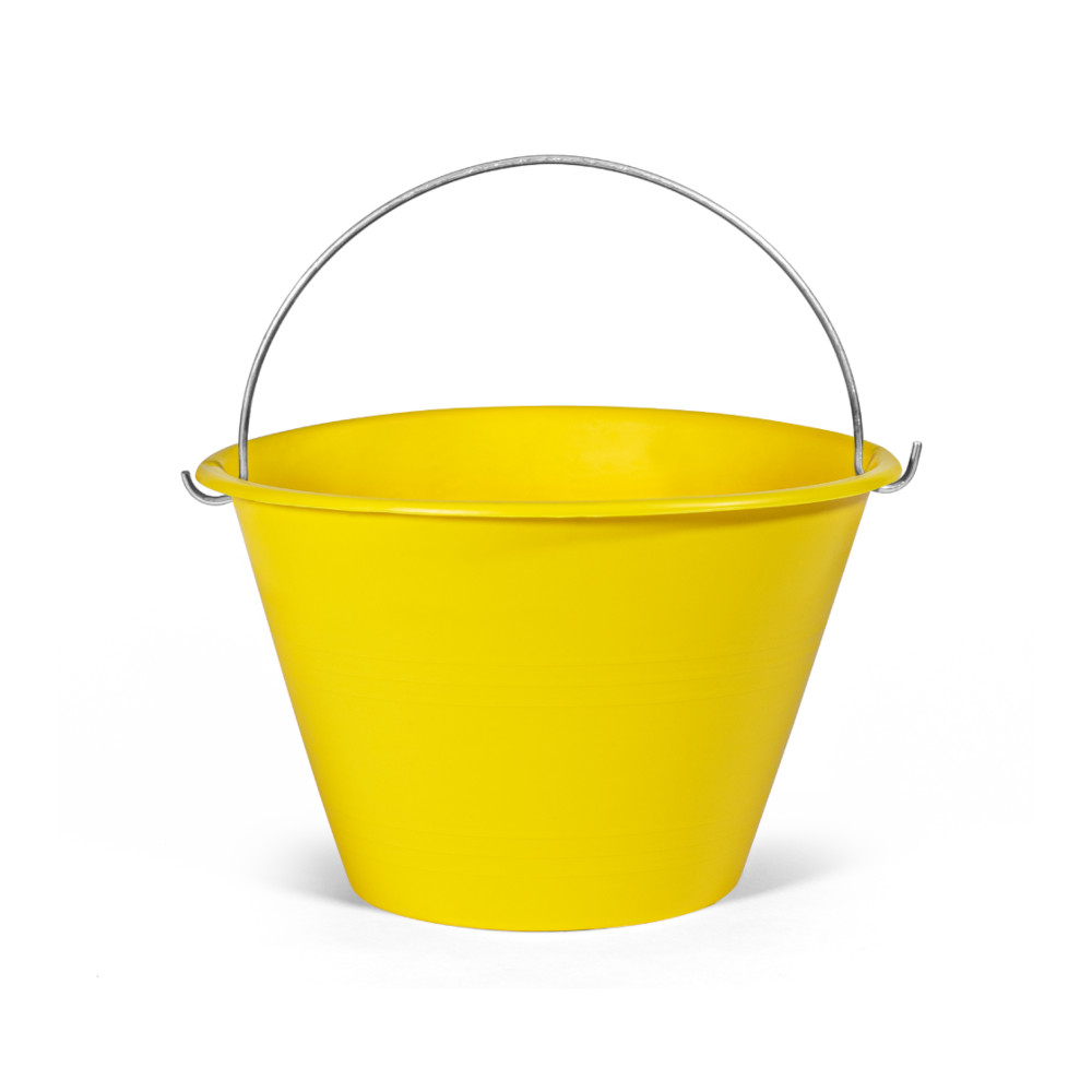 Il secchio muratore plastica rinforzata giallo è uno strumento essenziale utilizzato per il trasporto e per miscelare materiali come il cemento.