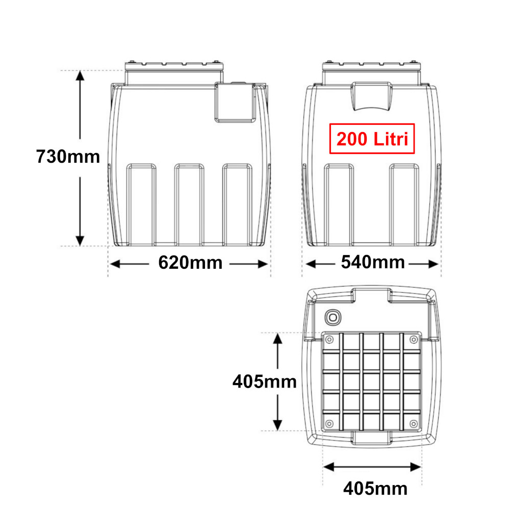 La stazione di sollevamento è realizzato in polietilene di colore nero, un materiale particolarmente noto per la sua resistenza ai raggi UV e alle intemperie, garantendo un prodotto di qualità e affidabilità nel tempo. Il serbatoio ha una struttura squadrata e compatta che occupa uno spazio ridotto, ideale per ambienti ristretti. La sua capacità di 200 litri offre una soluzione pratica ed efficiente.