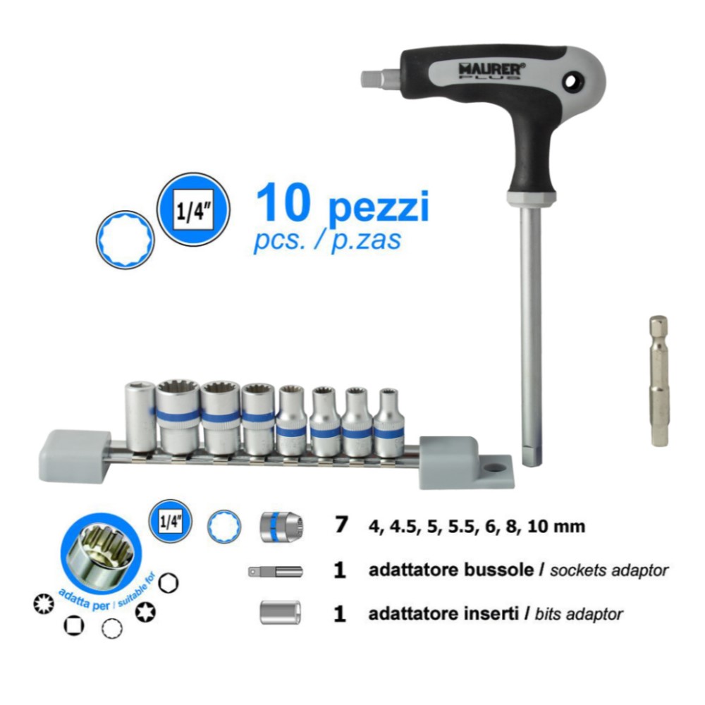 • 7 chiavi a bussola poligonali con attacco 1/4″ femmina (4mm-4,4mm-5mm-5,5mm-6mm-8mm-10mm);
