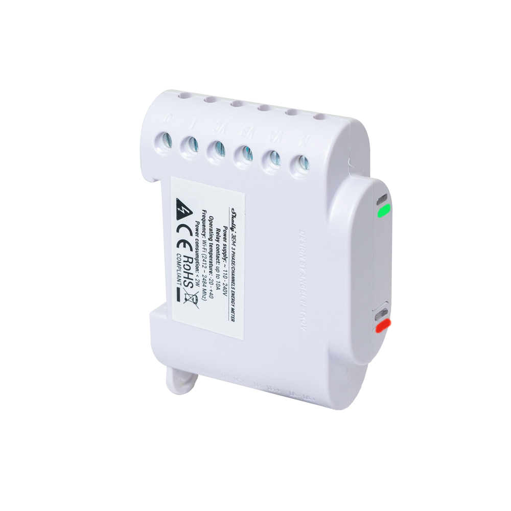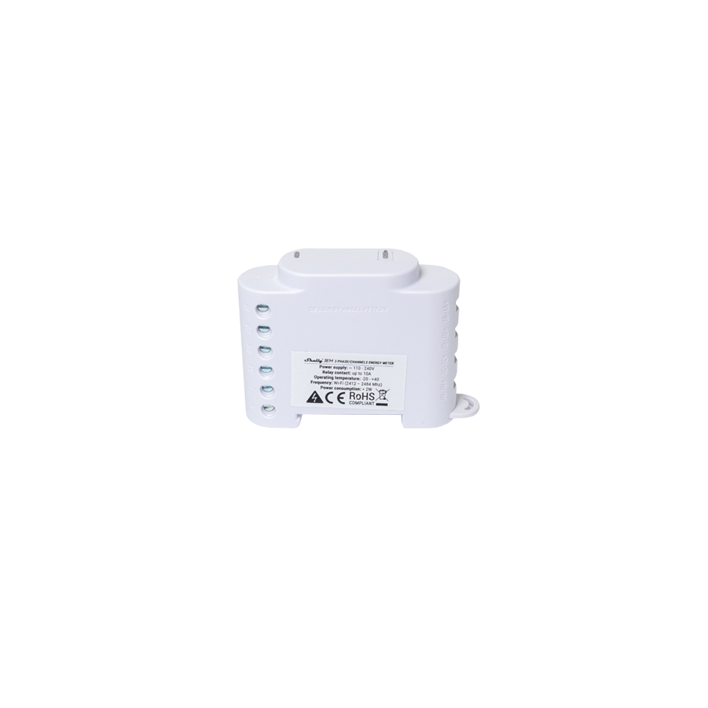 Lo Shelly 3EM opera attraverso alimentazione AC di 110-230V con una misurazione massima per ogni canale di 120 A/230V in AC. Il range di temperatura di esercizio va da 0° C a 40° C.