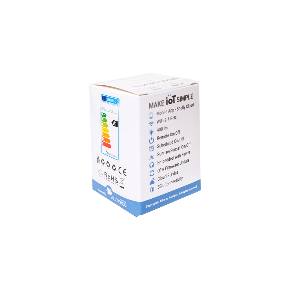 Shelly Duo è una lampadina Wi-Fi ideale per impostare la luce in base al tuo umore. Con il cursore dimmer potrai regolare la luminosità della lampadina, e, in aggiunta, gestire l’accensione e lo spegnimento in base agli orari di alba e tramonto attraverso la creazione di scene e animazioni sull’App Shelly.