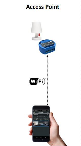 Access Point: lo smartphone si collega direttamente all’Access Point WiFi del dispositivo Shelly che genera una rete wifi senza password, e utilizzando il suo server raggiungibile alla pagina 192.168.33.1 è possibile visualizzare una pagina di gestione del dispositivo.