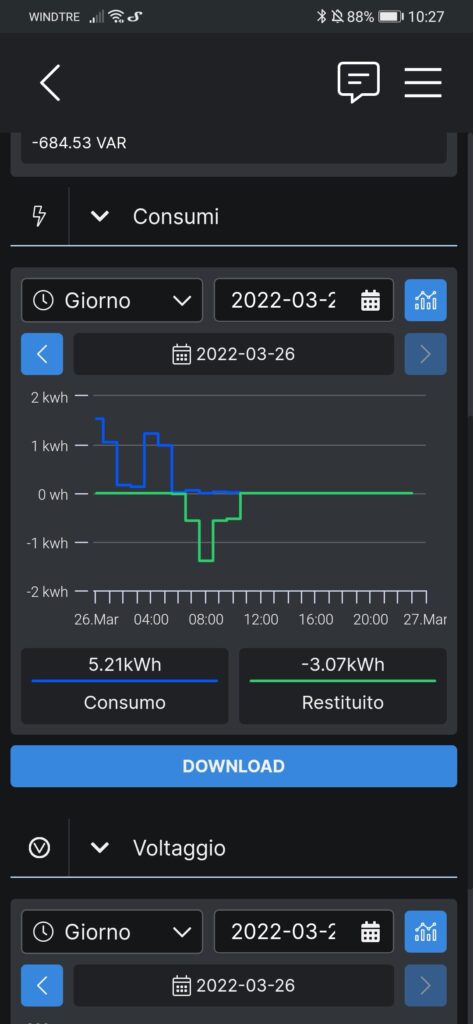 Alcuni dispositivi Shelly permettono inoltre la misurazione dei consumi, tipo l’assorbimento del nostro contatore di casa, la produzione di un fotovoltaico e, inoltre, la conservazione (nella memoria a bordo del dispositivo) dello storico dei consumi.