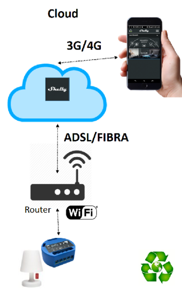Cloud: I dati che abbiamo inserito nel dispositivo vengono memorizzati ed inviati ad un Cloud, messo a disposizione da Allterco e poi successivamente immagazzinati e visionati dall’App Shelly installata sul nostro Smartphone, raggiungendo il Cloud tramite il collegamento alla rete 3G/4G.