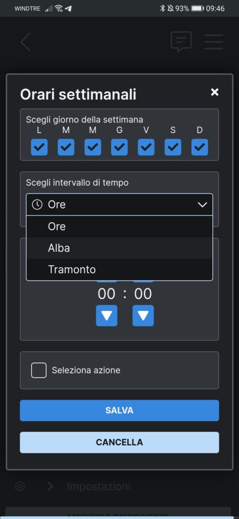 Ogni dispositivo di famiglia Shelly ti offre la possibilità di impostare la programmazione settimanale di accensione e spegnimento. Inoltre, possiede la funzione innovativa di poter impostare il dispositivo con le modalità Alba e Tramonto, molto utili per l’apertura e la chiusura automatica delle tapparelle elettriche.