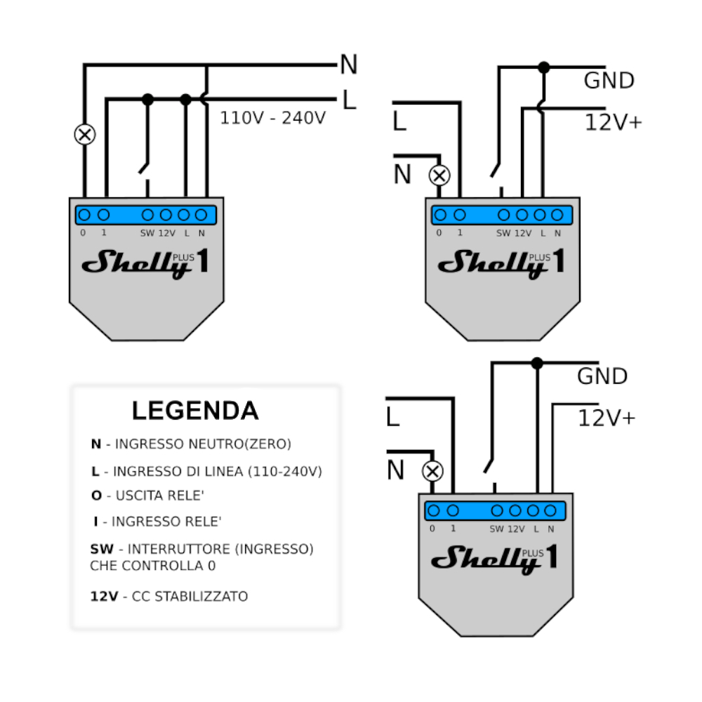 La particolarità dello Shelly 1 Plus è la possibilità di poter configurare il dispositivo utilizzando un Alimentatore per la corrente continua a 12V stabilizzato o a 24/220V sempre tramite Alimentatore.