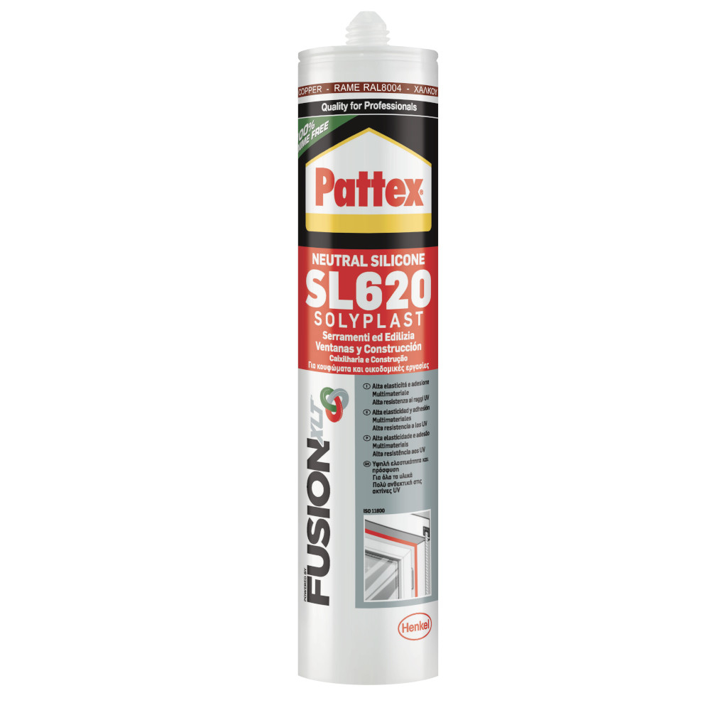 Il silicone  SL620 della Pattex da 300ml in rame e un sigillante siliconico ideale per sigillature in edilizia. Resistente alle muffe, agli agenti atmosferici ad acidi bassi diluiti e raggi UV. Certificato ISO 11600. Facile da applicare e da lisciare, impermeabile. Buona adesione, senza primer, su numerosi supporti come vetro, piastrelle, ceramica, alluminio, acciaio, acciaio inox, legno, poliestere, policarbonato, PVC, calcestruzzo ecc. SL620 può essere inoltre applicato per la sigillatura di giunti perimetrali, applicazione in interni ed esterni e per sigillature di giunti di connessione nel campo delle costruzioni, è disponibile in svariati colori