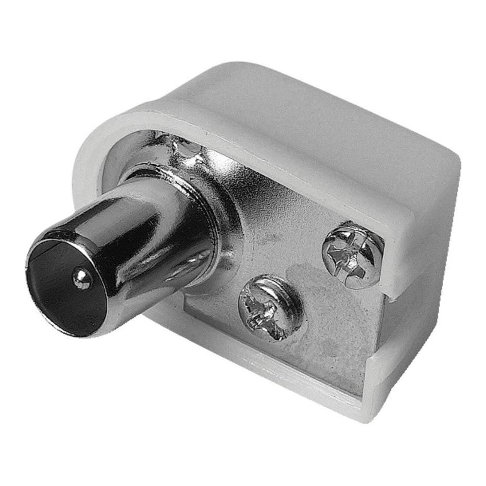 Connettore TV maschio coassiale piatta ad angolo con fissaggio a vite. Utilizzato per cablare cavi e prolunghe per televisioni e decoder.